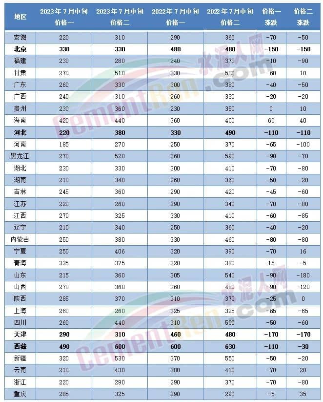 從水泥人網(wǎng)信息中心重點監(jiān)控的600多家企業(yè)近期報價來看,同比上年同期,北京、天津、河北、西藏等區(qū)域均有超過100元/噸的下跌。其中天津市7月中旬報價290~310元/噸,較上年同期460~480元/噸報價下跌達170元/噸。