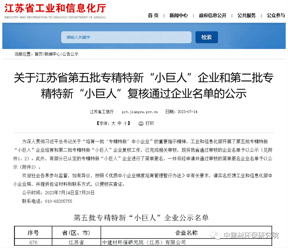 近日,根據(jù)工業(yè)和信息化部統(tǒng)一部署,江蘇省工業(yè)和信息化廳發(fā)布了《關(guān)于江蘇省第五批專精特新“小巨人”企業(yè)和第二批專精特新“小巨人”復(fù)核通過企業(yè)名單》,經(jīng)公示后,中建材環(huán)保研究院(江蘇)有限公司憑借創(chuàng)新能力強(qiáng)、質(zhì)量效益優(yōu)、行業(yè)地位高等競爭力被認(rèn)定為國家級專精特新“小巨人”企業(yè)。
