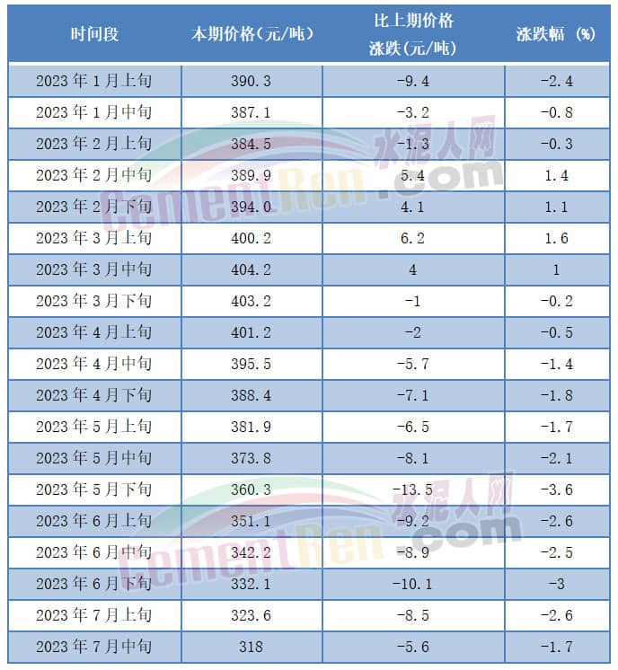 2023年7月中旬流通領(lǐng)域普通硅酸鹽水泥(P.O 42.5)散裝水泥報價318元/噸,同比上年同期下跌54.2元/噸,跌幅14.34%。
