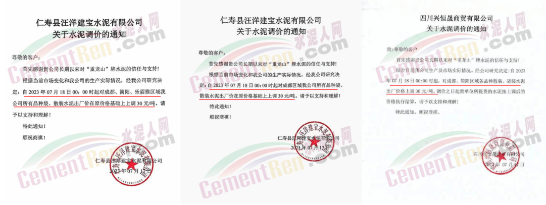 17日—18日,四川亞東、紅獅等水泥企業(yè)通知上調(diào)30元/噸;
