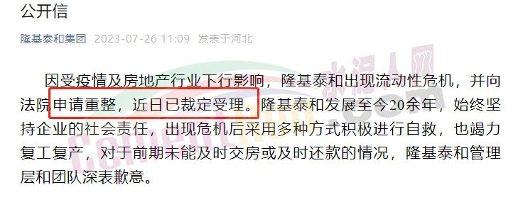 近日,隆基泰和發(fā)布公開信,因受疫情及房地產(chǎn)行業(yè)下行影響,企業(yè)出現(xiàn)流動性危機,并向法院申請重整,近日已裁定受理。其還表示,出現(xiàn)危機后采用多種方式積極進(jìn)行自救,也竭力復(fù)工復(fù)產(chǎn),對于前期未能及時交房或及時還款的情況,隆基泰和管理層和團隊深表歉意。