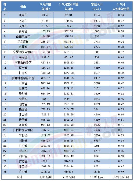 從分省市數(shù)據(jù)來看,前5月,廣東以產(chǎn)量5588.8萬噸位列第一,同比增長0.68%;江蘇產(chǎn)量5384.14萬噸排在第二,同比增長4.76%;安徽產(chǎn)量5146.9萬噸排在第三,同比下降1.15%。除西藏自治區(qū)人均水泥產(chǎn)量在1噸以上外,其他30個省市自治區(qū)人均產(chǎn)量均不足1噸。