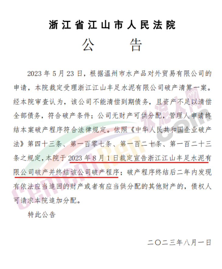 8月1日浙江省江山市人民法院發(fā)布公告稱,2023年5月23日,根據(jù)溫州市水產(chǎn)品對外貿(mào)易有限公司的申請,裁定受理浙江江山豐足水泥有限公司破產(chǎn)清算一案。