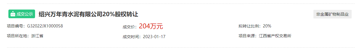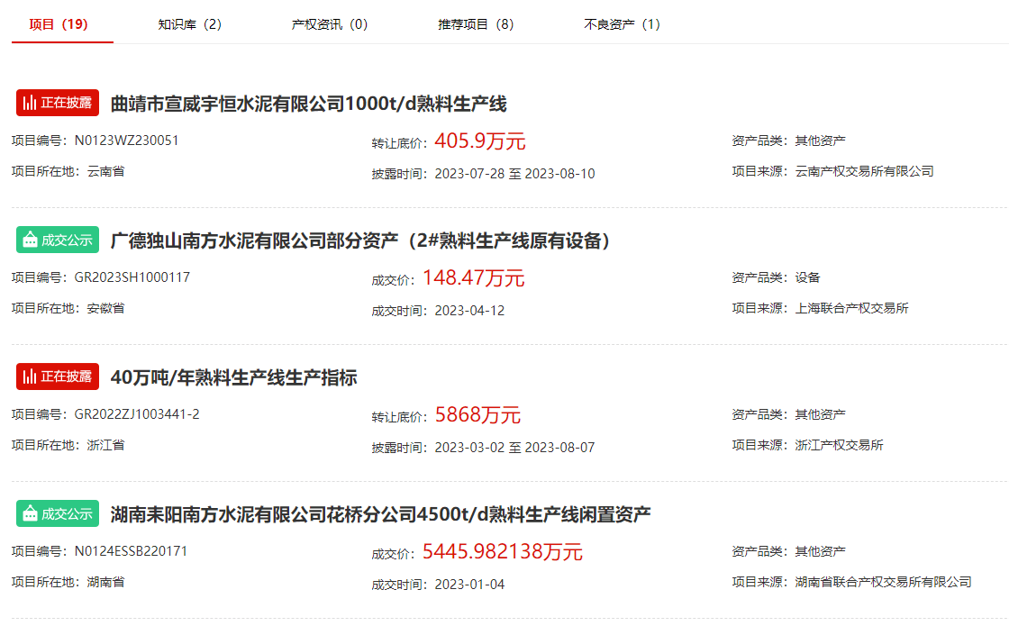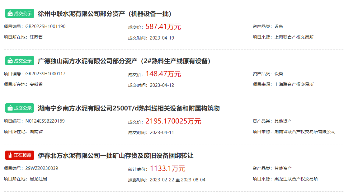 另有包含華潤水泥、冀東水泥、萬年青水泥在內(nèi)的4家品牌企業(yè)公開出讓企業(yè)股權(quán);包含行業(yè)知名企業(yè)蕪湖海螺水泥在內(nèi)的兩家企業(yè)公開出讓土地使用權(quán);包含天山水泥、中聯(lián)水泥、南方水泥、北方水泥、冀東水泥在內(nèi)的14家企業(yè)公開出讓熟料生產(chǎn)線、熟料指標(biāo)、房屋建筑物、構(gòu)筑物及機(jī)器設(shè)備等資產(chǎn)。
