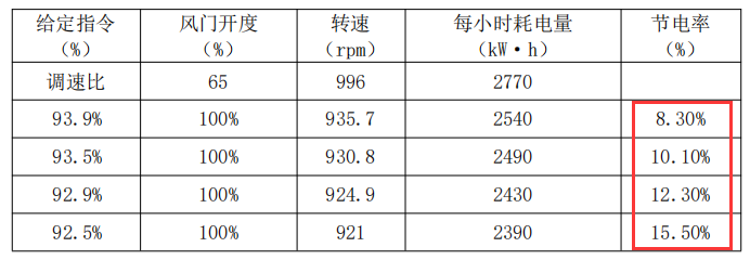 相較于工頻轉(zhuǎn)速,65度風(fēng)門(mén)開(kāi)度節(jié)電率約為15.5%。