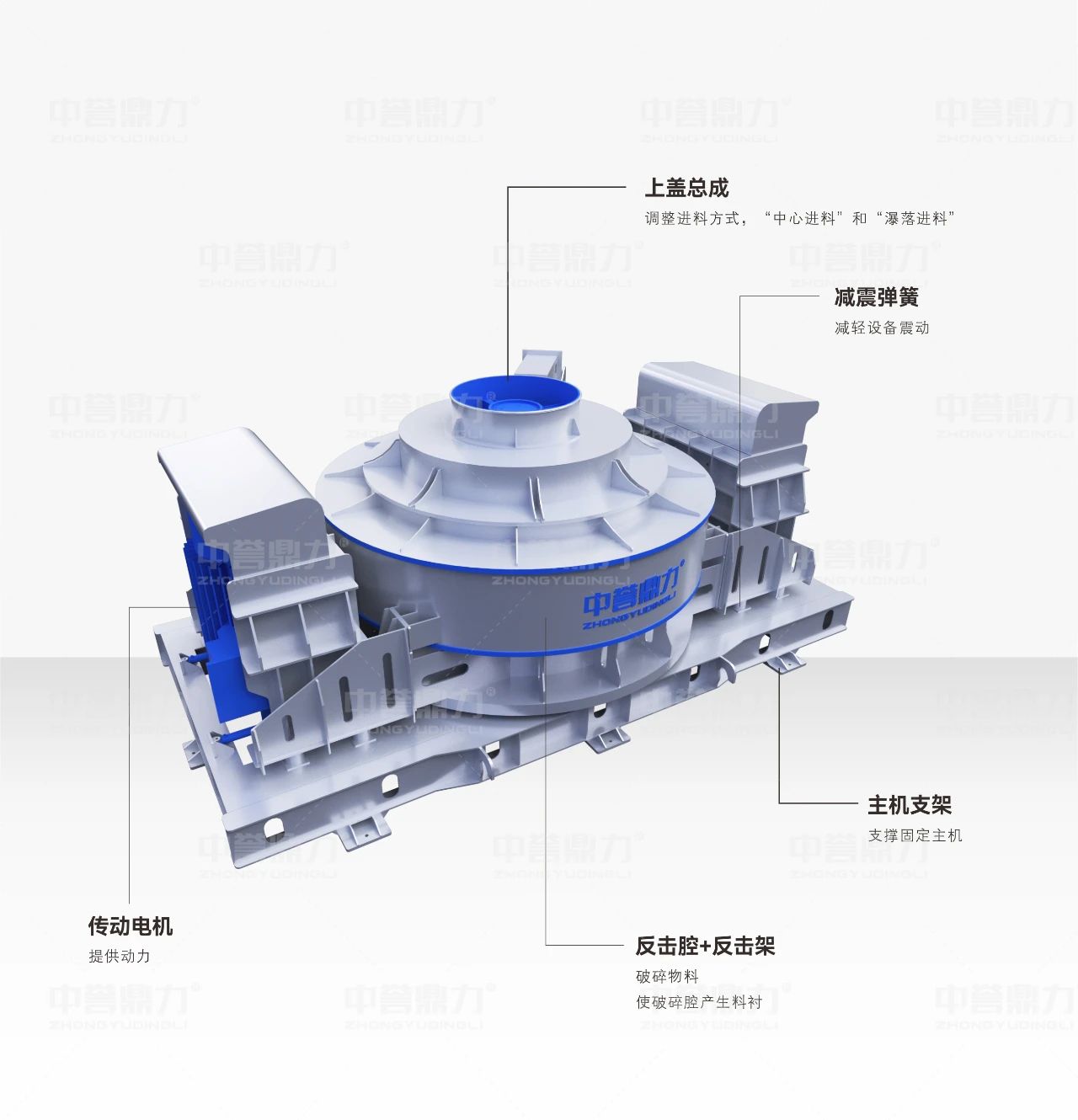 中譽鼎力新型沖擊破碎機通過中心進料+瀑落進料的方式,以多重的設計優(yōu)勢和優(yōu)質(zhì)的制造選材,確保設備的平穩(wěn)運行和更長壽命;同時提高設備可靠性,減少停機時間,降低維修成本。