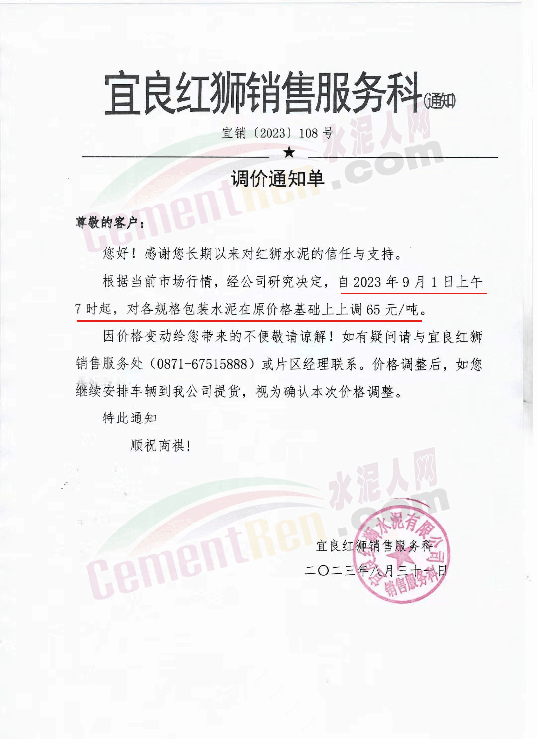 宜良紅獅銷售服務(wù)科通知,根據(jù)當(dāng)前市場行情,經(jīng)公司研究決定自2023年9月1日上午7時起,對各規(guī)格包裝水泥在原價格基礎(chǔ)上上調(diào)65元/噸。對紅獅牌PO42.5、PO52.5散裝水泥在原價格基礎(chǔ)上上調(diào)30元/噸。