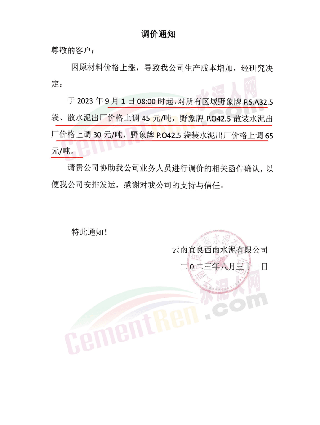 云南宜良西南水泥有限公司通知,因原材料價格上漲,導(dǎo)致公司生產(chǎn)成本增加,經(jīng)研究決定:于2023年9月1日8時起對所有區(qū)域野象牌PSA32.5袋、散水泥出廠價格上調(diào)45元/噸,野象牌PO42.5散裝水泥出廠價格上調(diào)30元/噸,野象牌PO42.5袋裝水泥出廠價格上調(diào)65元/噸。