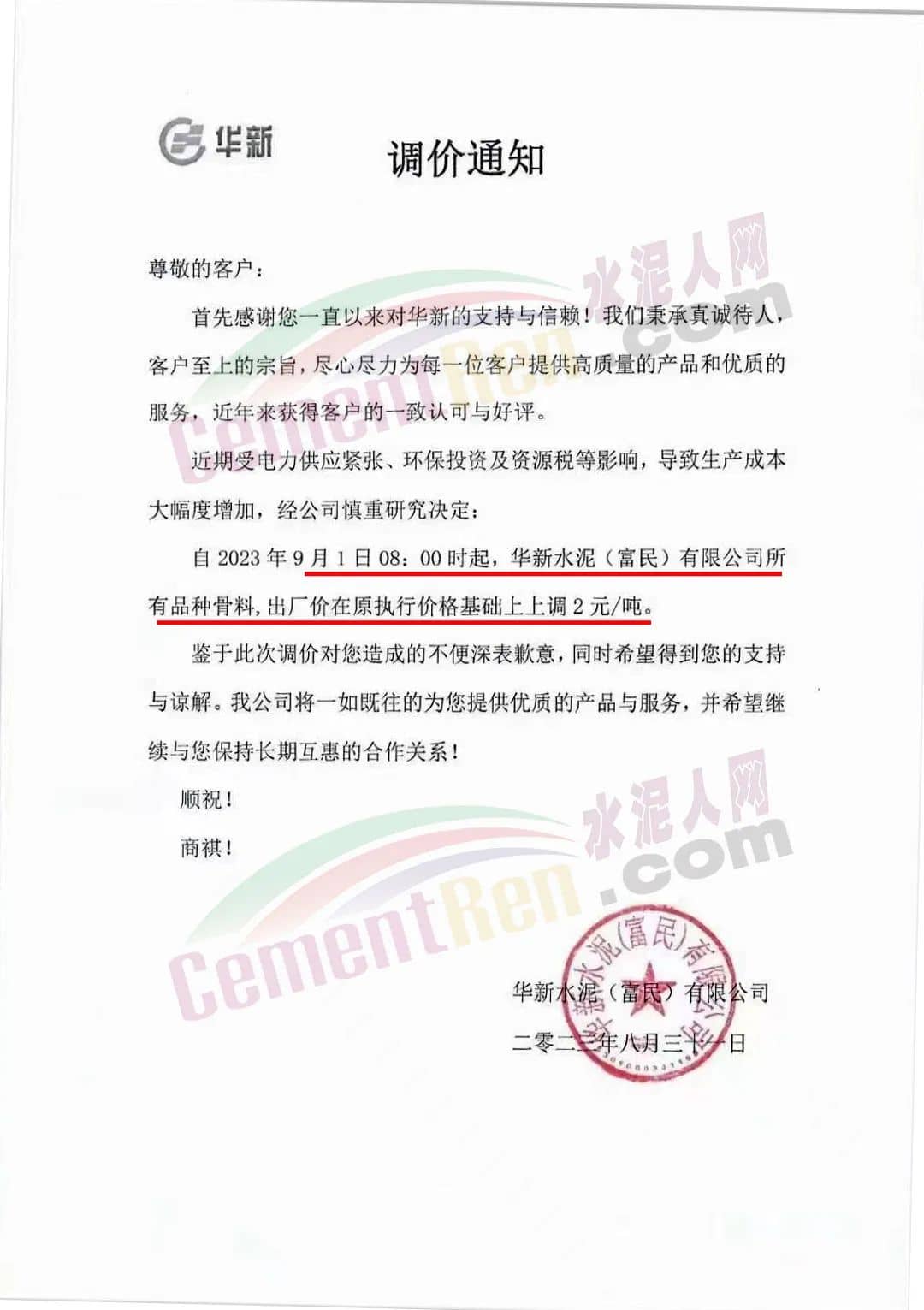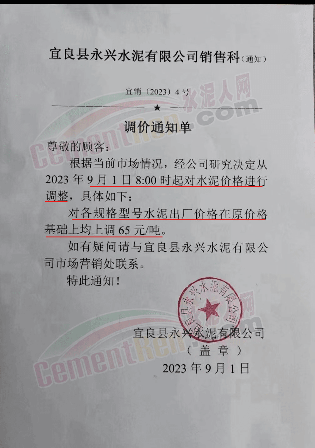 宜良縣永興水泥有限公司通知,根據(jù)當(dāng)前市場情況,經(jīng)公司研究決定從2023年9月1日8時起對各規(guī)格型號水泥出廠價格在原價格基礎(chǔ)上均上調(diào)65元/噸。