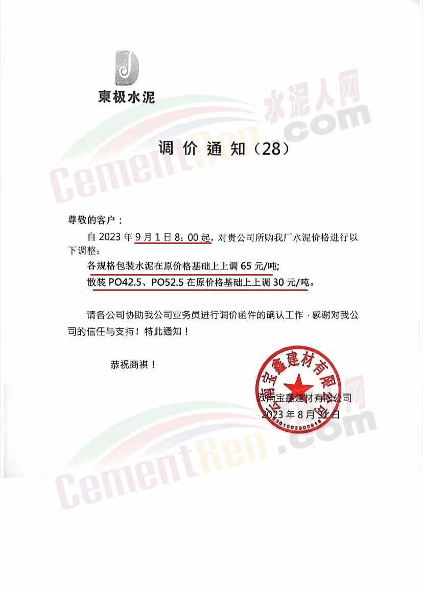 云南寶鑫建材有限公司通知,自2023年9月1日8時起,對各規(guī)格包裝水泥在原價格基礎(chǔ)上上調(diào)65元/噸;散裝PO425、PO525在原價格基礎(chǔ)上上調(diào)30元/噸。