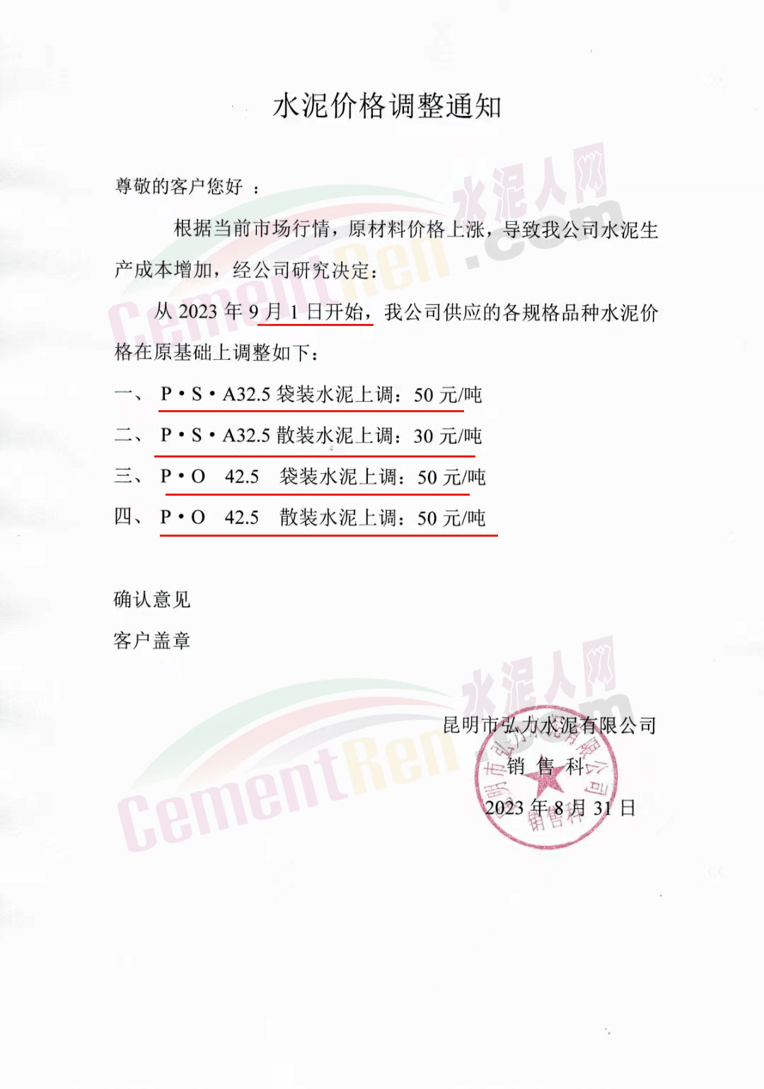昆明市弘力水泥有限公司通知,根據(jù)當(dāng)前市場行情,原材料價格上漲,導(dǎo)致公司水泥生產(chǎn)成本增加,經(jīng)公司研究決定從2023年9月1日開始,公司供應(yīng)的P·S·A32.5袋裝水泥上調(diào)50元/噸,P·S·A32.5散裝水泥上調(diào)30元/噸;P·042.5袋裝水泥上調(diào)50元/噸,P·O42.5散裝水泥上調(diào)50元/噸。