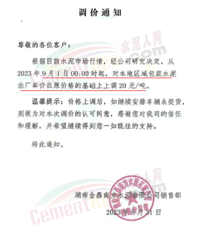 湖南金磊南方水泥有限公司銷售部通知,根據(jù)目前水泥市場行情,經(jīng)公司研究決定從9月1日0時起,對本地區(qū)域包裝水泥出廠單價在原價格基礎(chǔ)上上調(diào)20元/噸。