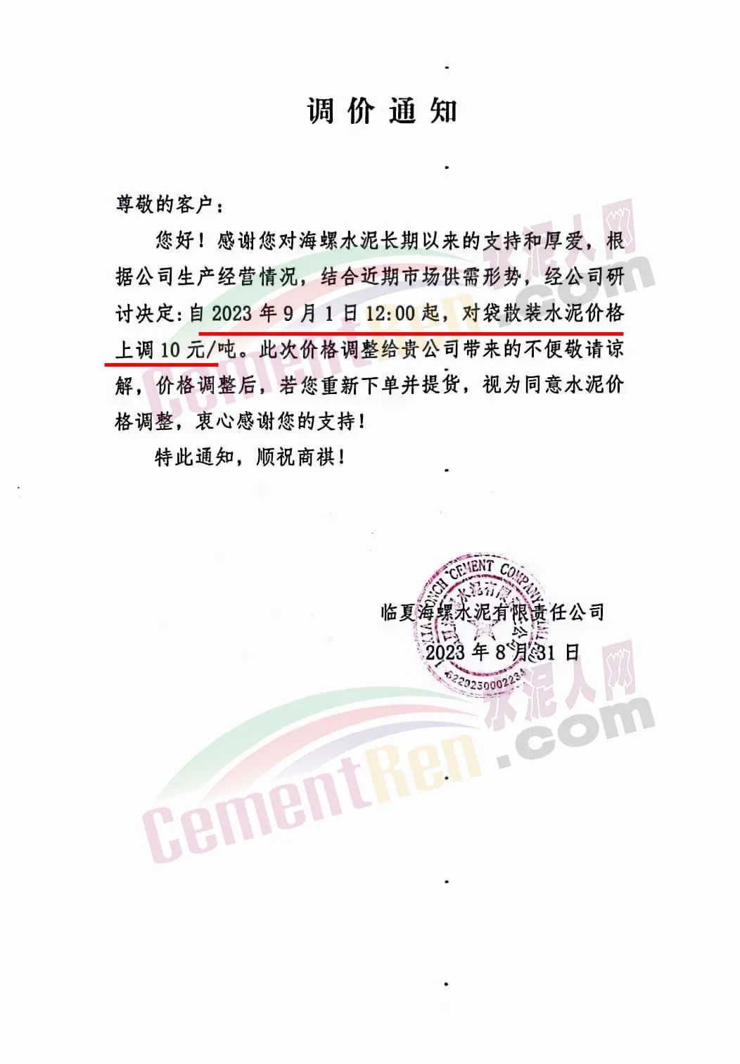 臨夏海螺水泥有限責(zé)任公司通知,根據(jù)公司生產(chǎn)經(jīng)營情況,結(jié)合近期市場供需形勢,經(jīng)公司研討決定:自2023年9月1日12時起,對袋散裝水泥價格上調(diào)10元/噸。