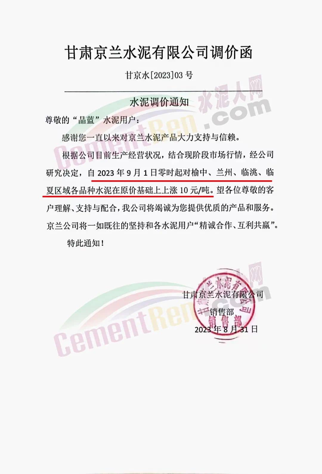 甘肅京蘭水泥有限公司通知,根據(jù)公司目前生產(chǎn)經(jīng)營狀況,結(jié)合現(xiàn)階段市場行情,經(jīng)公司研究決定,自2023年9月1日零時起對榆中、蘭州、臨洮、臨夏區(qū)域各品種水泥在原價基礎(chǔ)上上漲10元/噸。