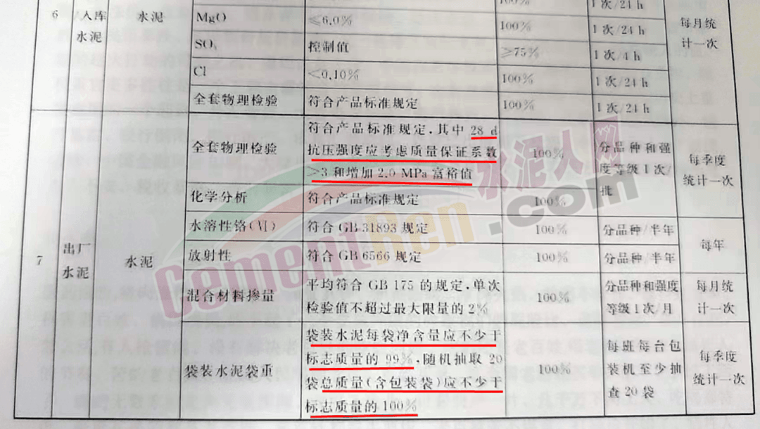 全套物理檢驗項目指標要求,除符合產(chǎn)品標準規(guī)定外,28天抗壓強度應(yīng)考慮質(zhì)量保證系統(tǒng)大于3和增加2Mpa富余值。同時要求袋裝水泥每袋凈含量不少于標稱質(zhì)量的99%。