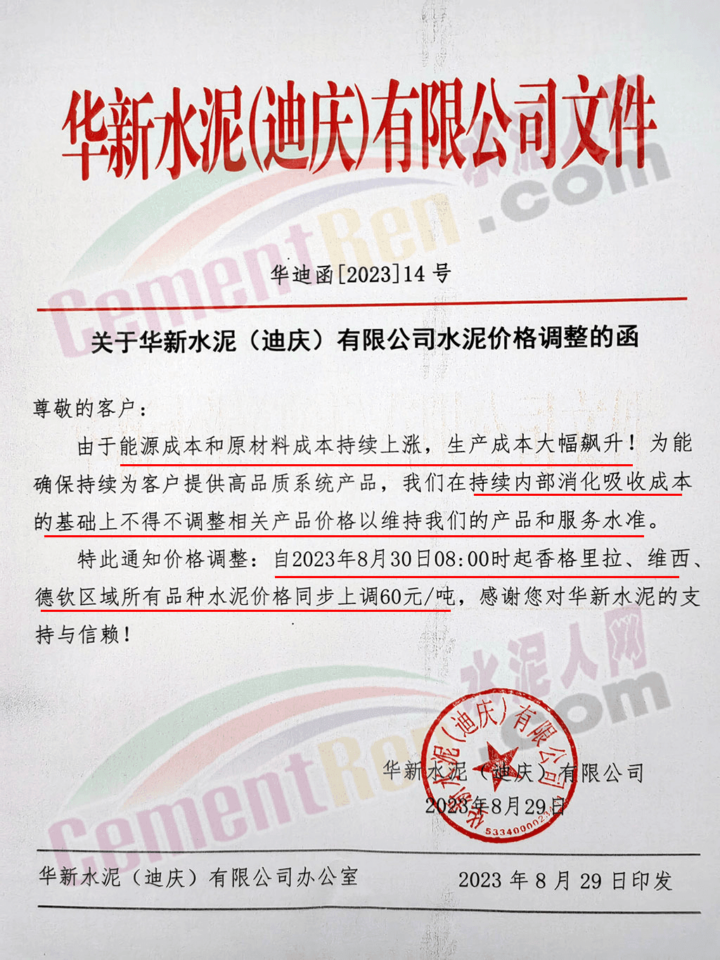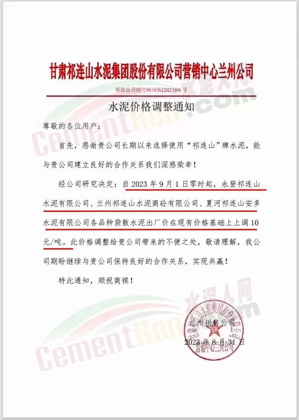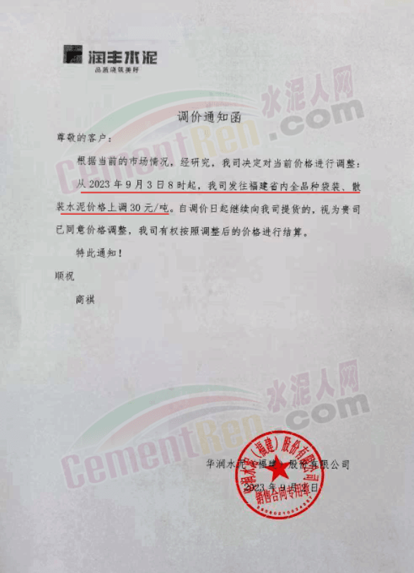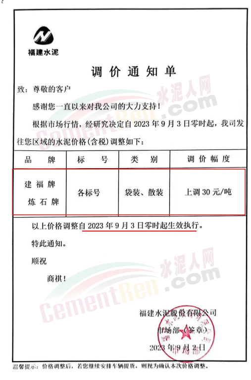 福建水泥股份有限公司通知,根據(jù)市場行情,經(jīng)研究決定自2023年9月3日0時(shí)起,公司“建福牌、煉石牌”發(fā)往各區(qū)域的水泥含稅價(jià)格上調(diào)30元/噸。