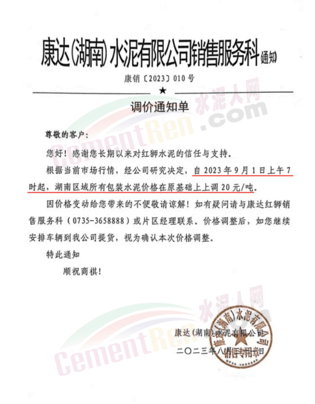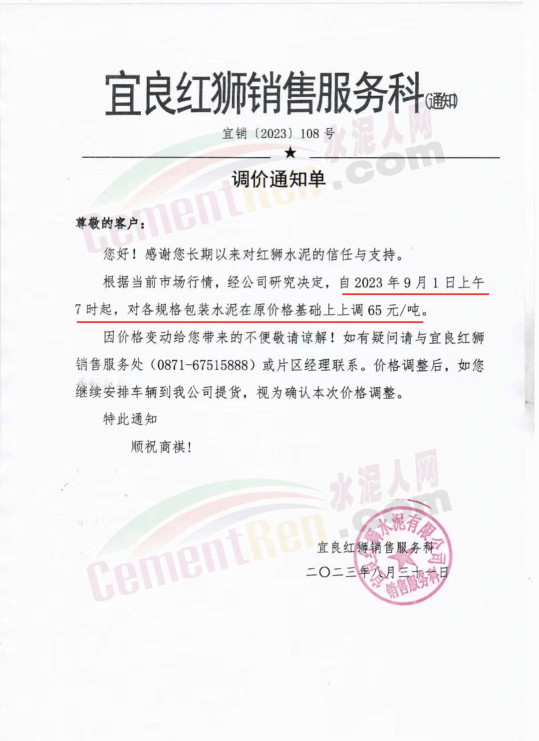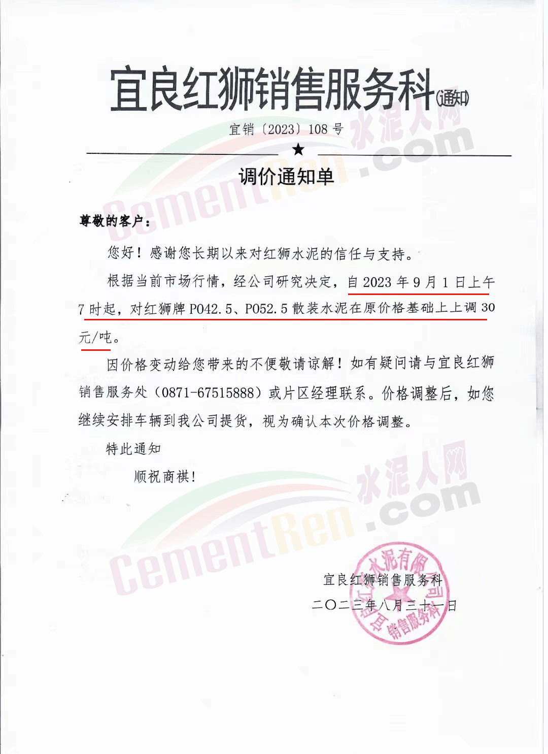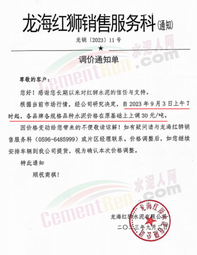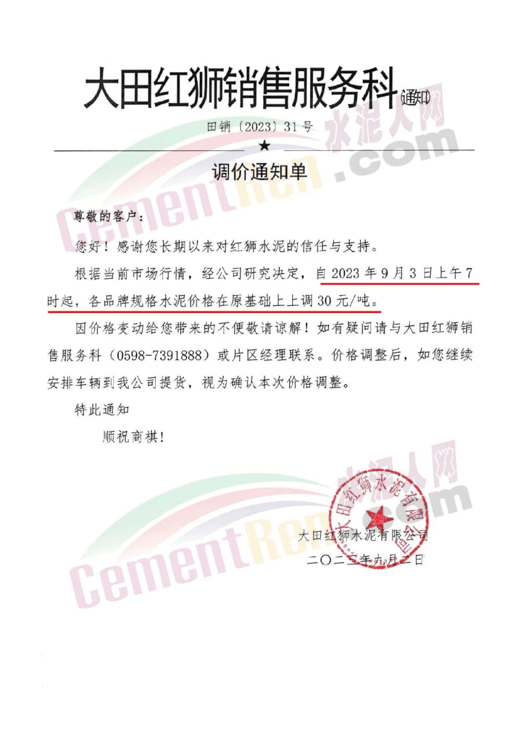 龍海紅獅、大田紅獅銷售服務(wù)科通知,根據(jù)當(dāng)前市場行情,經(jīng)公司研究決定,自2023年9月3日上午7時(shí)起,各品牌各規(guī)格品種水泥價(jià)格在原基礎(chǔ)上上調(diào)30元/噸。