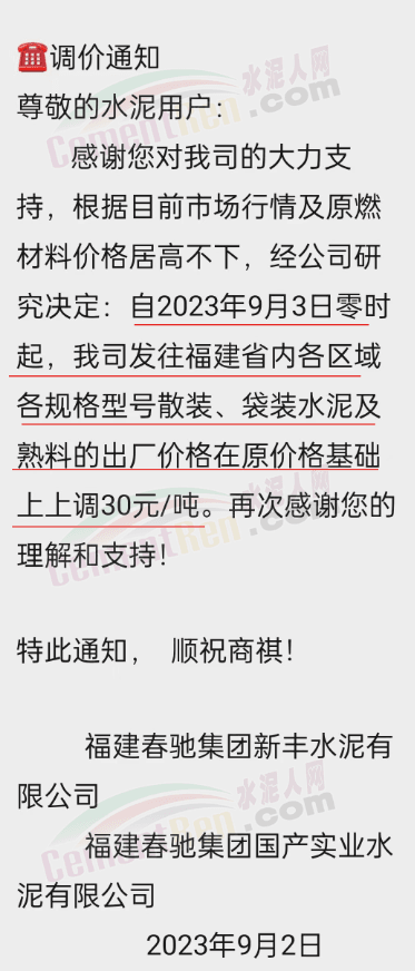 福建春馳集團(tuán)新豐水泥有限公司 福建春馳集團(tuán)國產(chǎn)實(shí)業(yè)水泥有限公司通知,根據(jù)目前市場行情及原燃材料價(jià)格居高不下,經(jīng)公司研究決定:自2023年9月3日0時(shí)起,公司發(fā)往福建省內(nèi)各區(qū)域各規(guī)格型號散裝、袋裝水泥及熟料的出廠價(jià)格在原價(jià)格基礎(chǔ)上上調(diào)30元/噸。