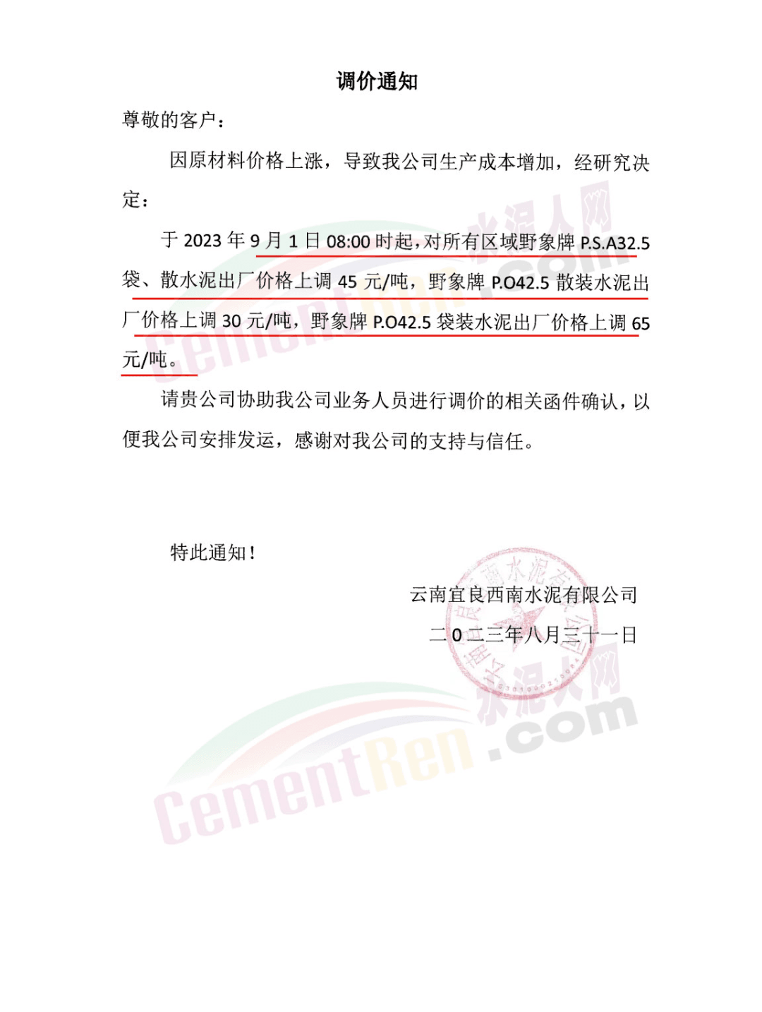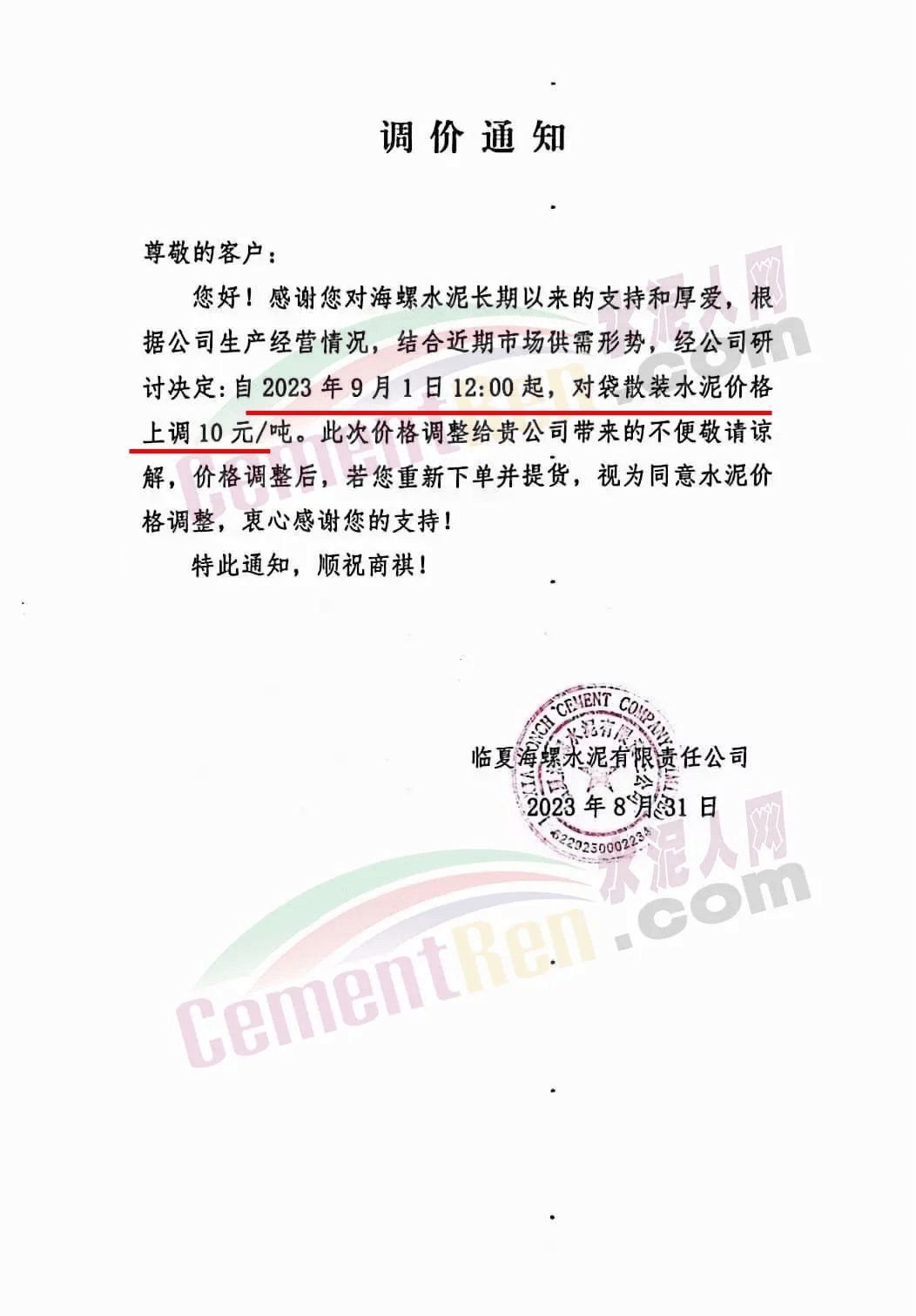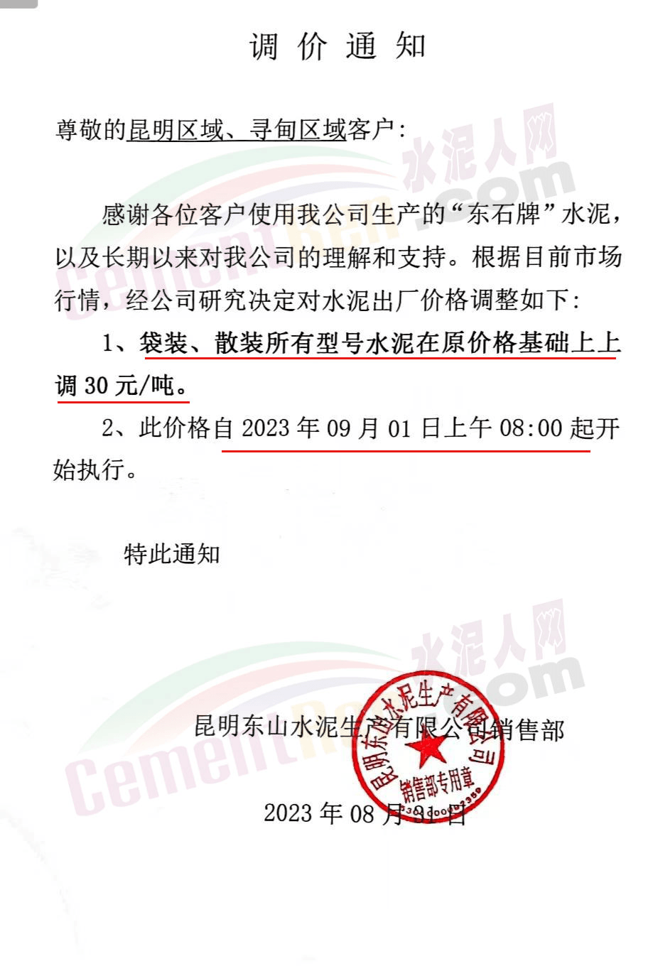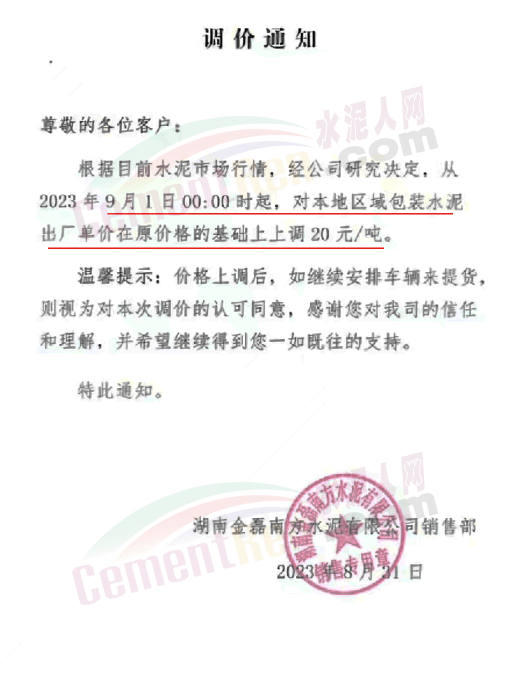 福建三明南方水泥有限公司通知,根據(jù)目前市場行情,經(jīng)公司研究決定,自2023年9月3日零時(shí)起公司各品種袋裝、散裝水泥出廠價(jià)在原有基礎(chǔ)上上調(diào)30元/噸。