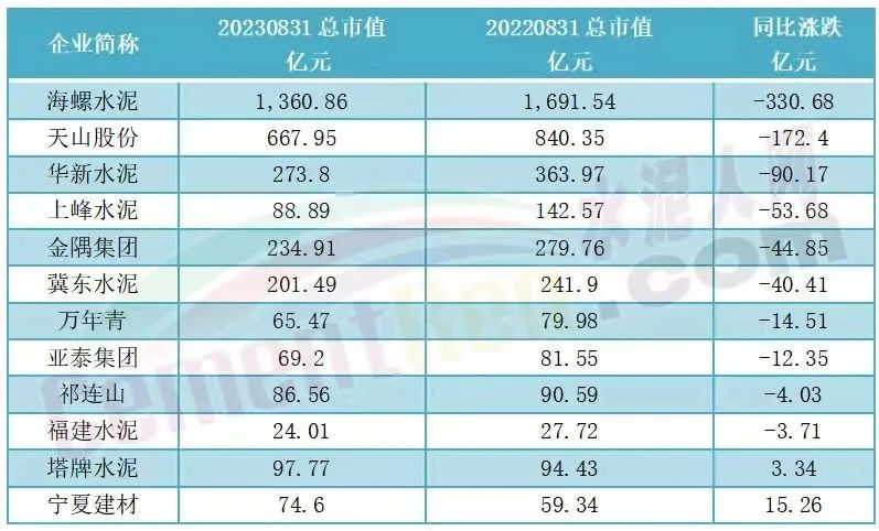 對(duì)比部分上市企業(yè)2022年同比市值下跌情況可見(jiàn),近一年來(lái)包括海螺水泥、冀東水泥、華新水泥等企業(yè)在內(nèi)的10家企業(yè)市值下滑合計(jì)達(dá)766.79億元,其中海螺水泥一年內(nèi)總市值下滑達(dá)330.68億元。