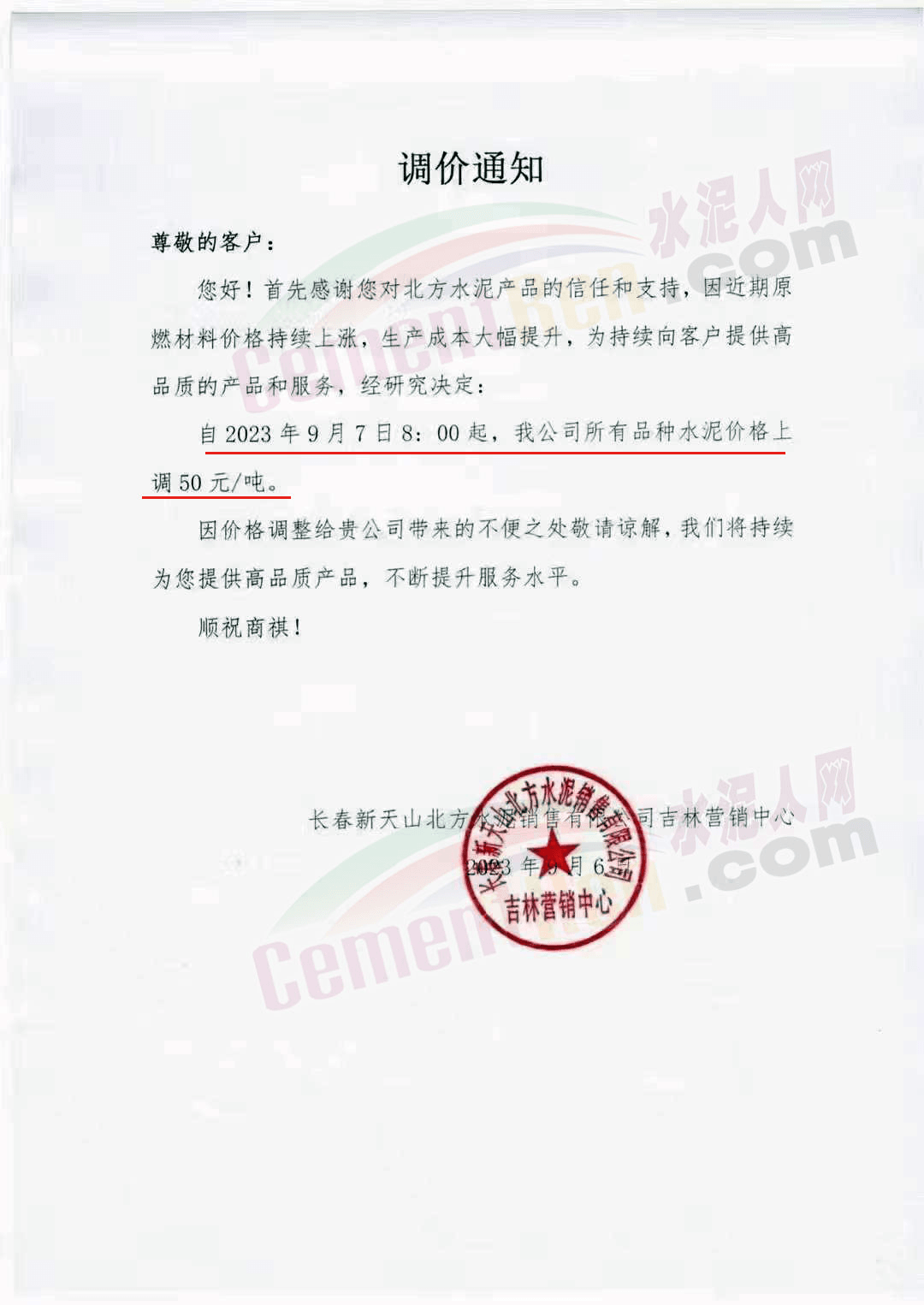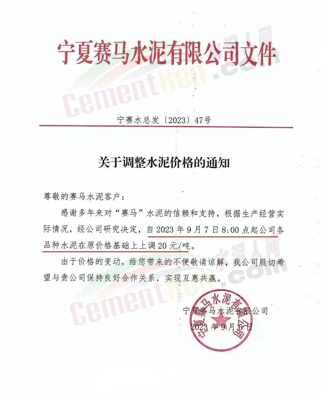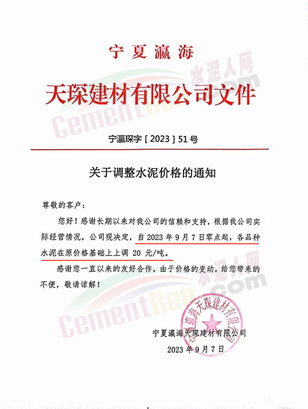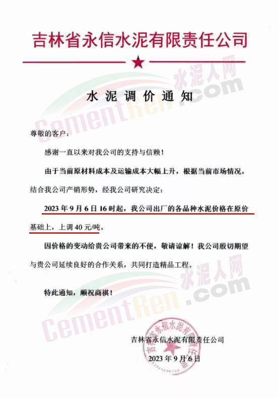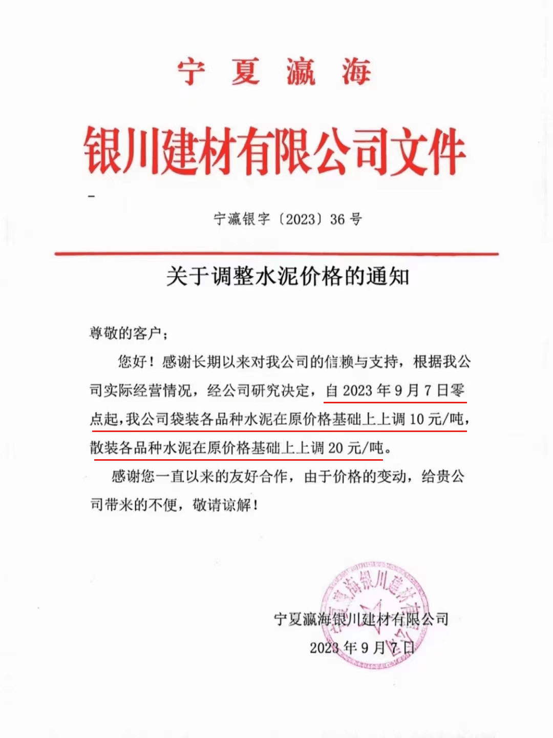 寧夏瀛海天琛建材有限公司通知,根據(jù)公司實(shí)際經(jīng)營(yíng)情況,公司決定,自2023年9月7日零點(diǎn)起,各品種水泥在原價(jià)格基礎(chǔ)上上調(diào)20元/噸。
