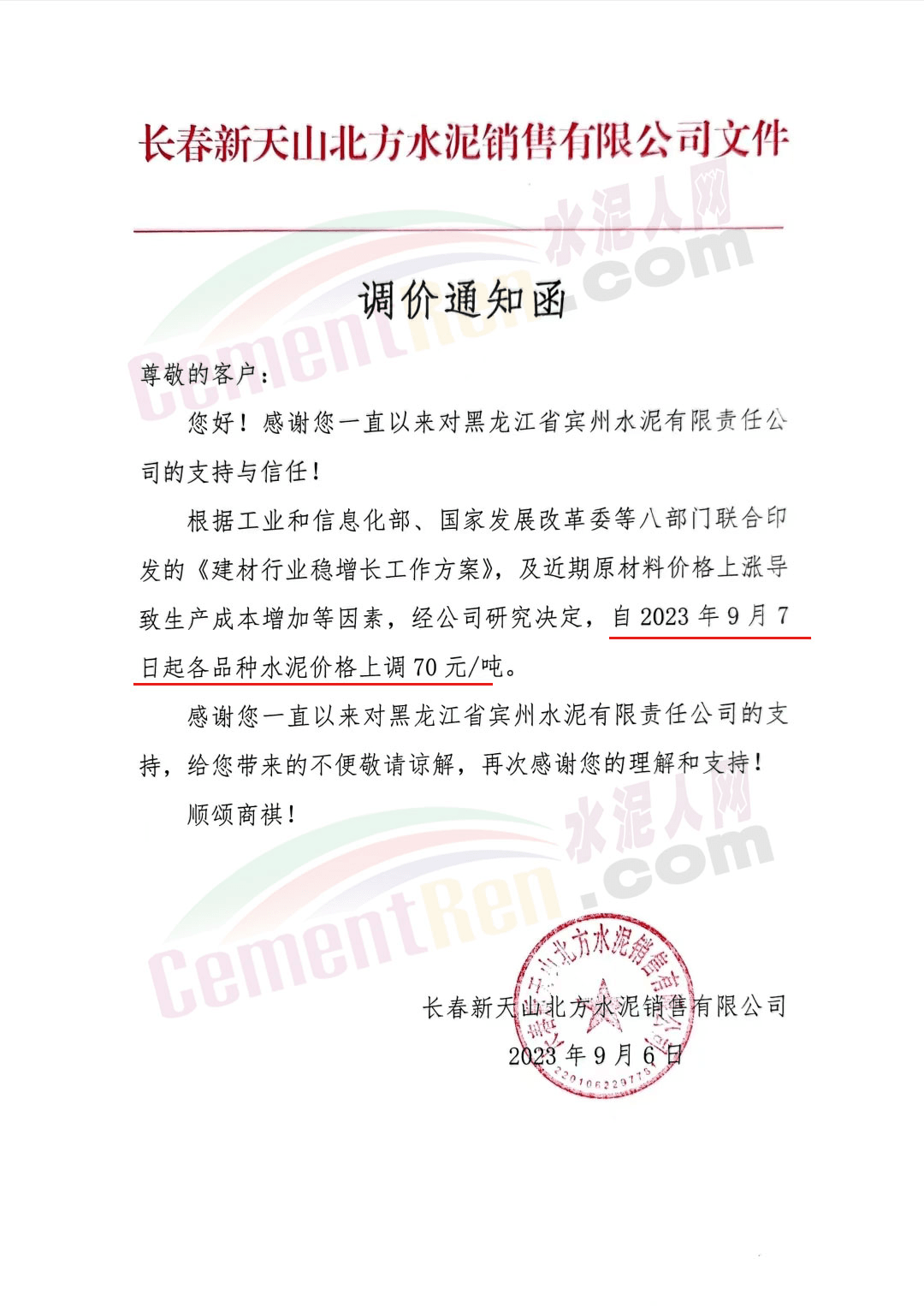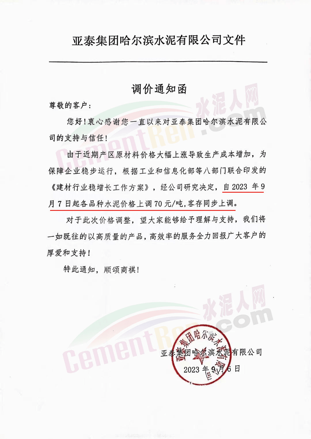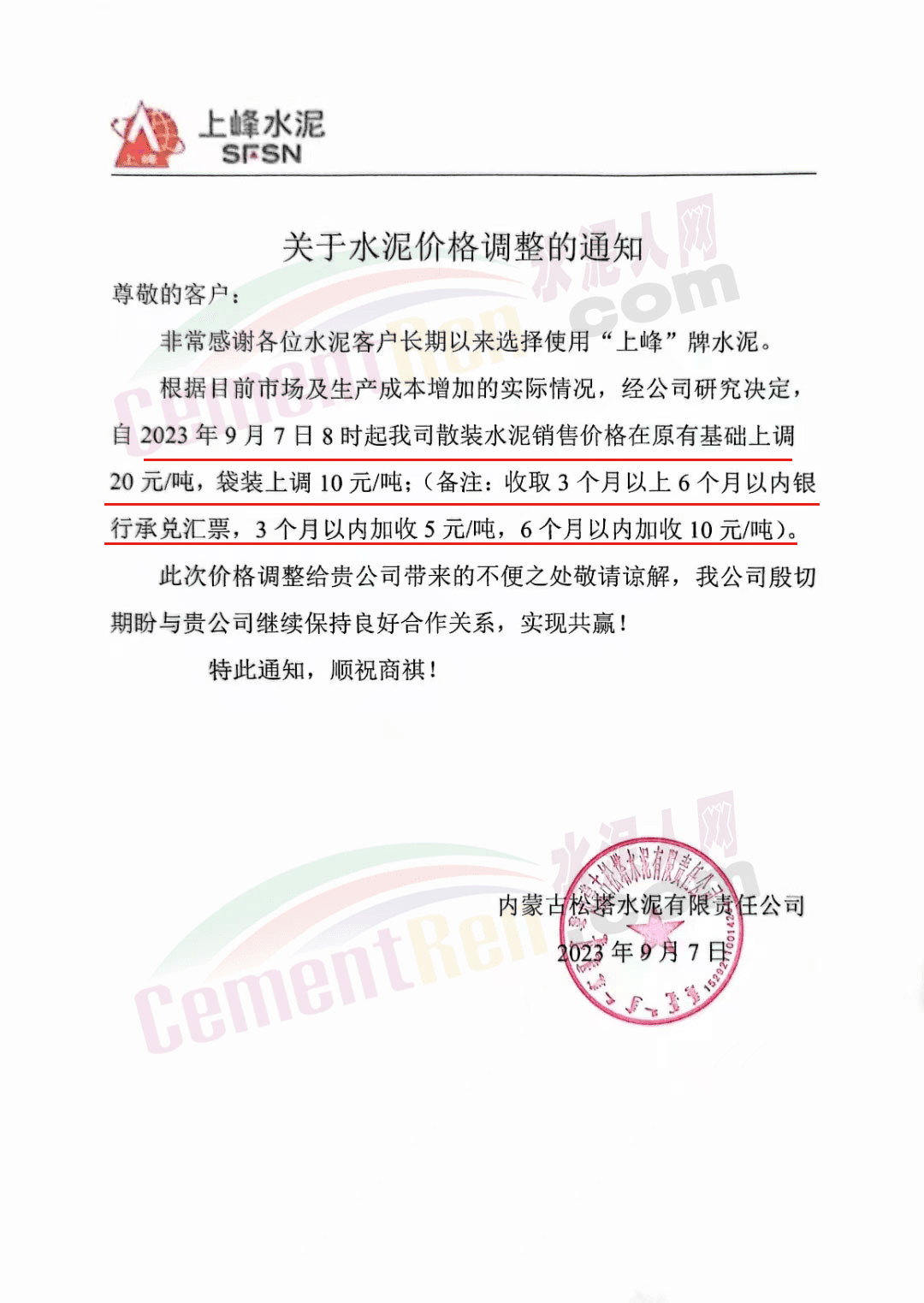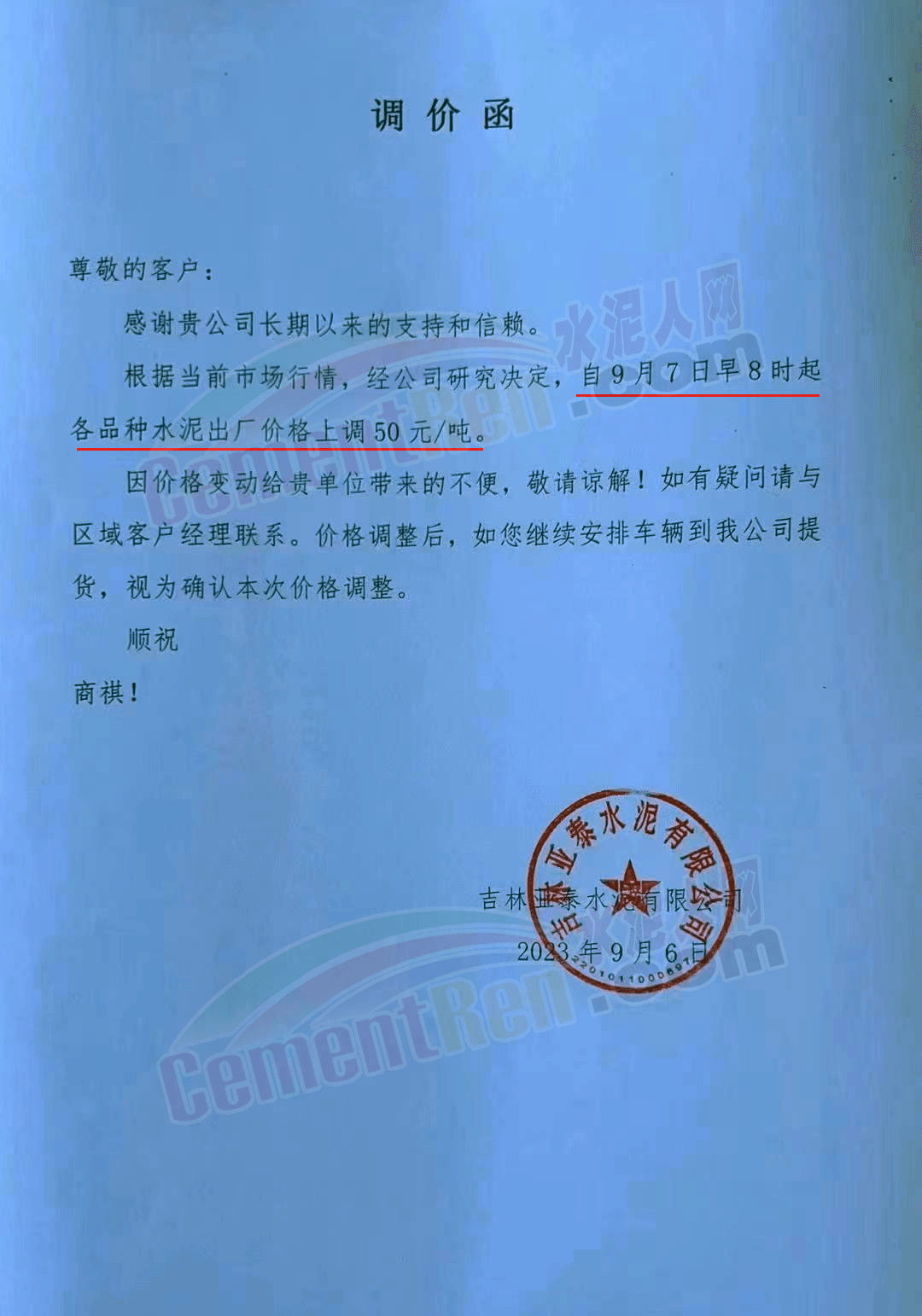 寧夏瀛海天琛建材有限公司通知,根據(jù)公司實(shí)際經(jīng)營(yíng)情況,公司決定,自2023年9月7日零點(diǎn)起,各品種水泥在原價(jià)格基礎(chǔ)上上調(diào)20元/噸。