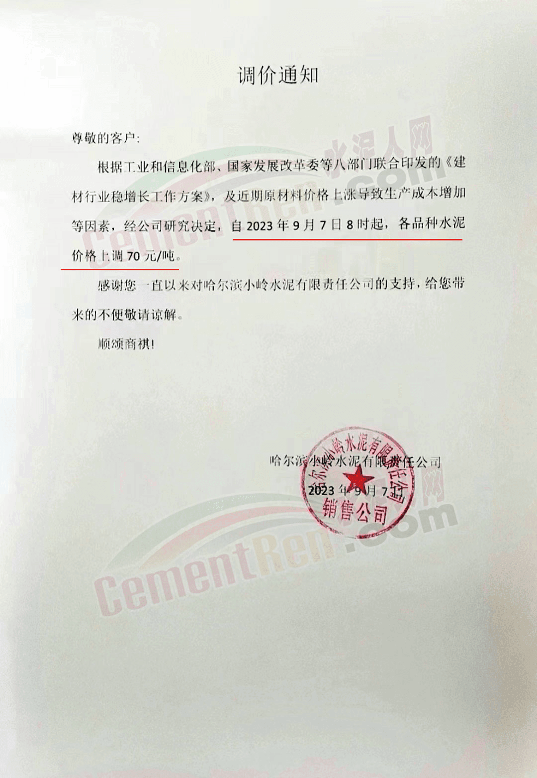 哈爾濱小嶺水泥有限責(zé)任公司通知,根據(jù)工業(yè)和信息化部、國(guó)家發(fā)展改革委等八部門聯(lián)合印發(fā)的《建材行業(yè)穩(wěn)增長(zhǎng)工作方案》,及近期原材料價(jià)格上漲導(dǎo)致生產(chǎn)成本增加等因素,經(jīng)公司研究決定,自2023年9月7日8時(shí)起,各品種水泥價(jià)格上調(diào)70元/噸。
