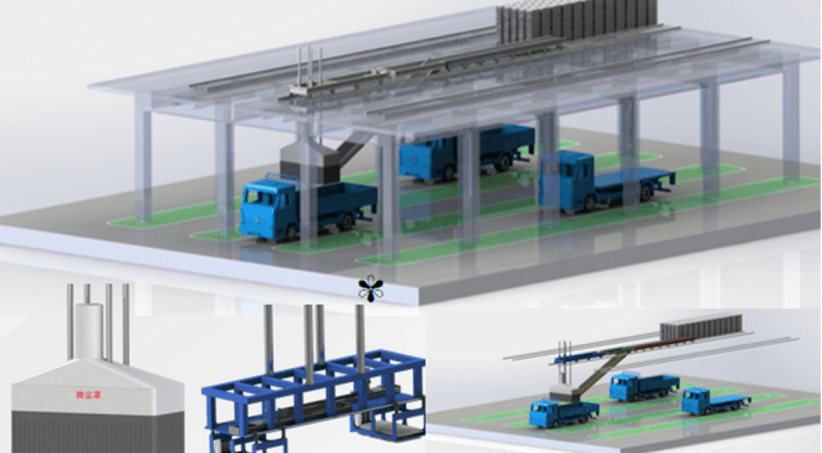 該系統(tǒng)涉及水泥行業(yè)中袋裝水泥智能裝車環(huán)節(jié),是適應市場需要的新產品,水泥從包裝機后端的輸送帶運出來,通過該系統(tǒng)自動裝車,全程不需人工介入。