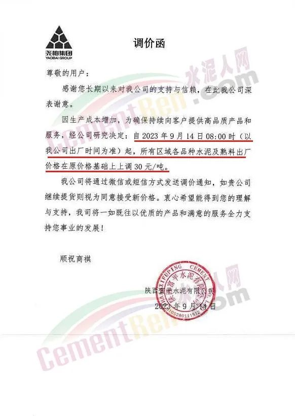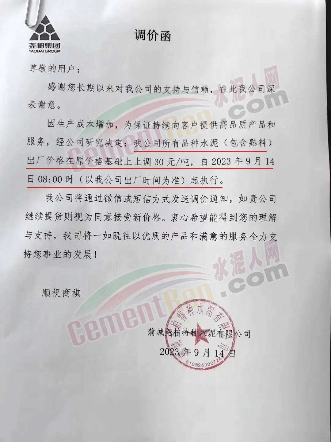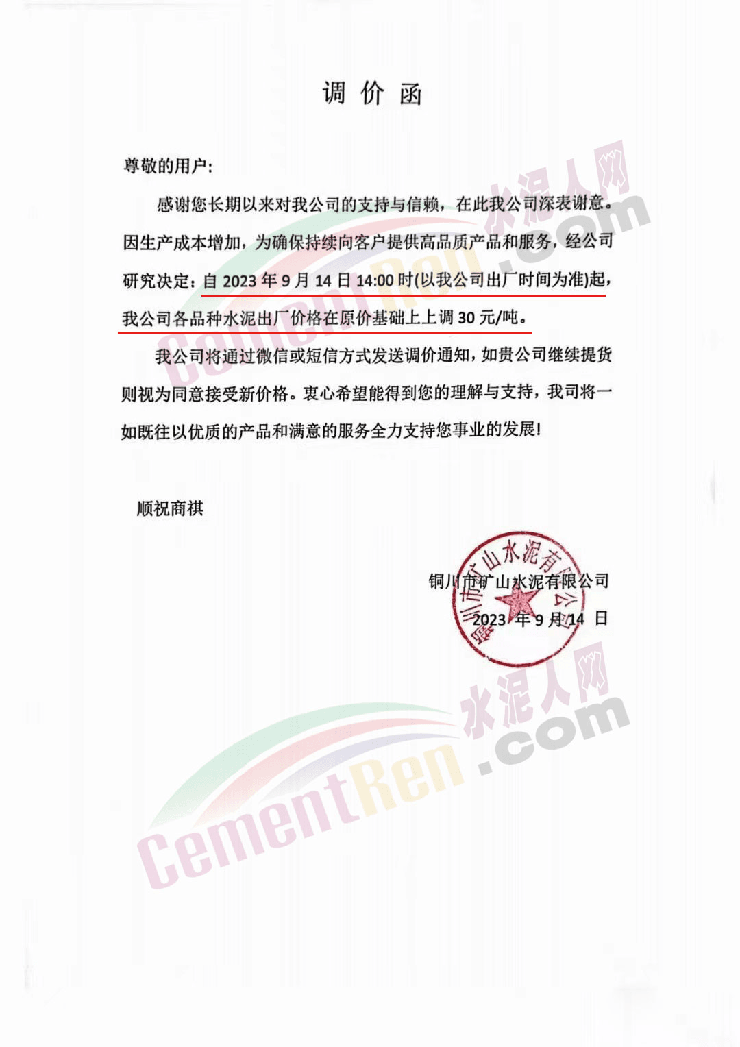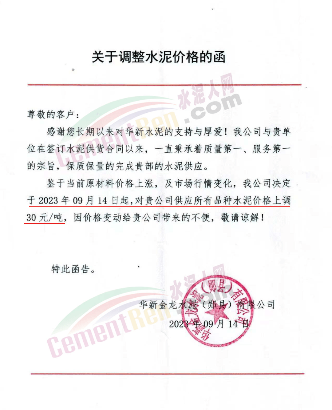 華新金龍水泥(鄖縣)有限公司通知,鑒于當(dāng)前原材料價格上漲,及市場行情變化,公司決定于2023年9月14日起所有品種水泥價格上調(diào)30元/噸。