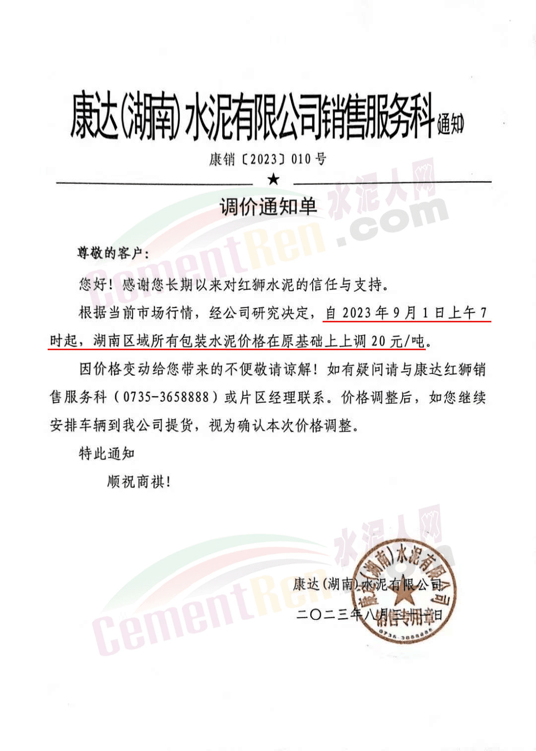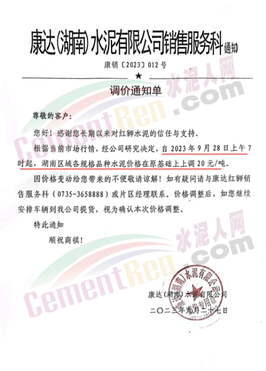 日前,重慶某品牌水泥渝東營銷中心秀山銷售部通知,根據(jù)周邊市場形勢,原燃材料持續(xù)攀升導(dǎo)致生產(chǎn)成本不斷增加,經(jīng)公司研究決定從2023年9月27日12時(shí)開始對花垣、保靖、龍山區(qū)域各品種水泥出廠價(jià)格上調(diào)20元/噸。