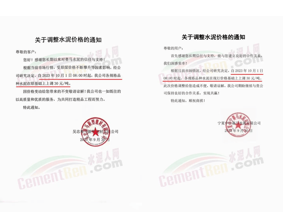10月1日,寧夏賽馬水泥、寧夏吳忠賽馬,寧夏中衛(wèi)賽馬、寧夏石嘴山賽馬等企業(yè)陸續(xù)通知,各規(guī)格品種水泥在原基礎(chǔ)上上調(diào)30元/噸。
