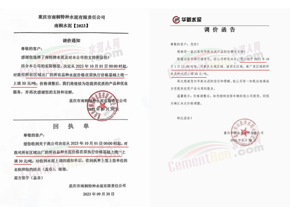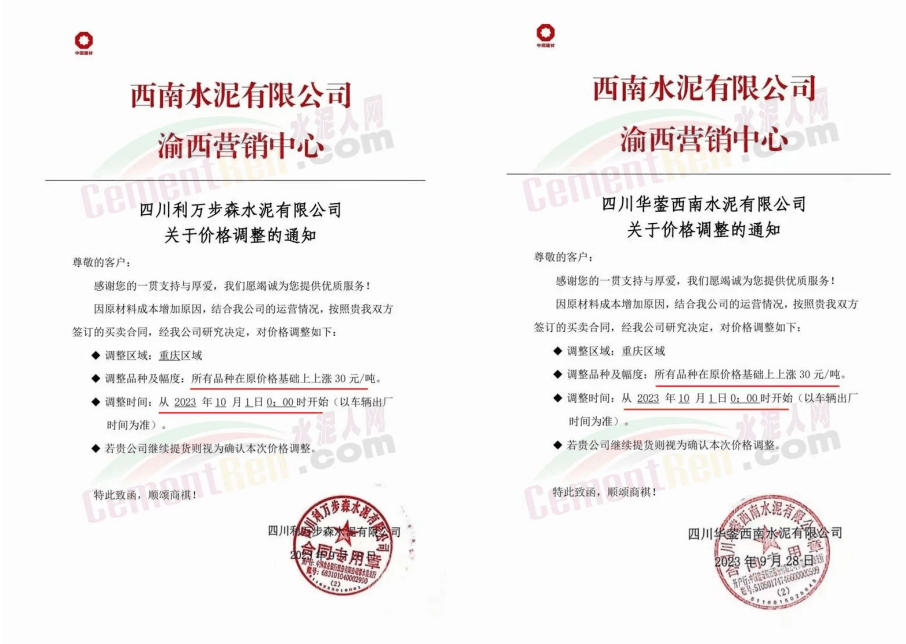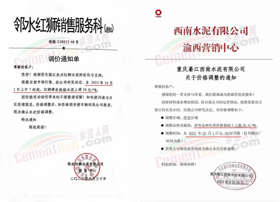 10月1日重慶金隅冀東、華新水泥、紅獅水泥、西南水泥渝西營銷中心等主要品牌企業(yè)通知,上調(diào)水泥價格30元/噸。