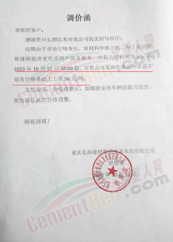 重慶弘揚(yáng)建材集團(tuán)衛(wèi)龍水泥有限公司通知稱,近期由于市場(chǎng)行情變化,原材料價(jià)格上漲,為了保證能夠繼續(xù)提供優(yōu)質(zhì)的產(chǎn)品及服務(wù),經(jīng)公司研究決定,從10月12日16時(shí)起,對(duì)公司采購(gòu)的各品種水泥在原有價(jià)格基礎(chǔ)上上調(diào)50元/噸。