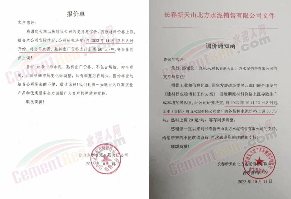 吉林區(qū)域,亞泰、北方、金隅冀東、山水水泥等企業(yè)通知上調(diào)水泥、熟料價(jià)格50-70元/噸。
