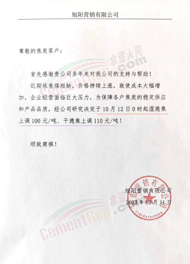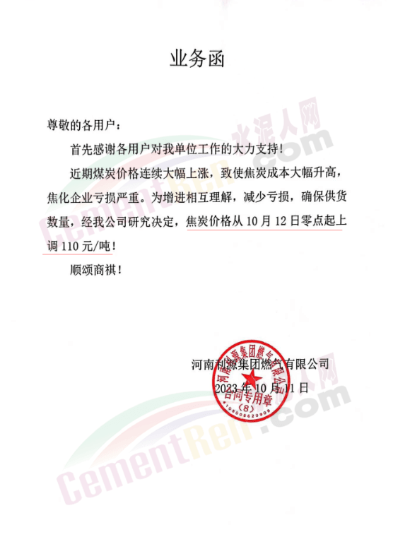 遼寧某混凝土企業(yè)通知,因水泥漲價(jià),混凝土報(bào)價(jià)上調(diào)10元/噸。