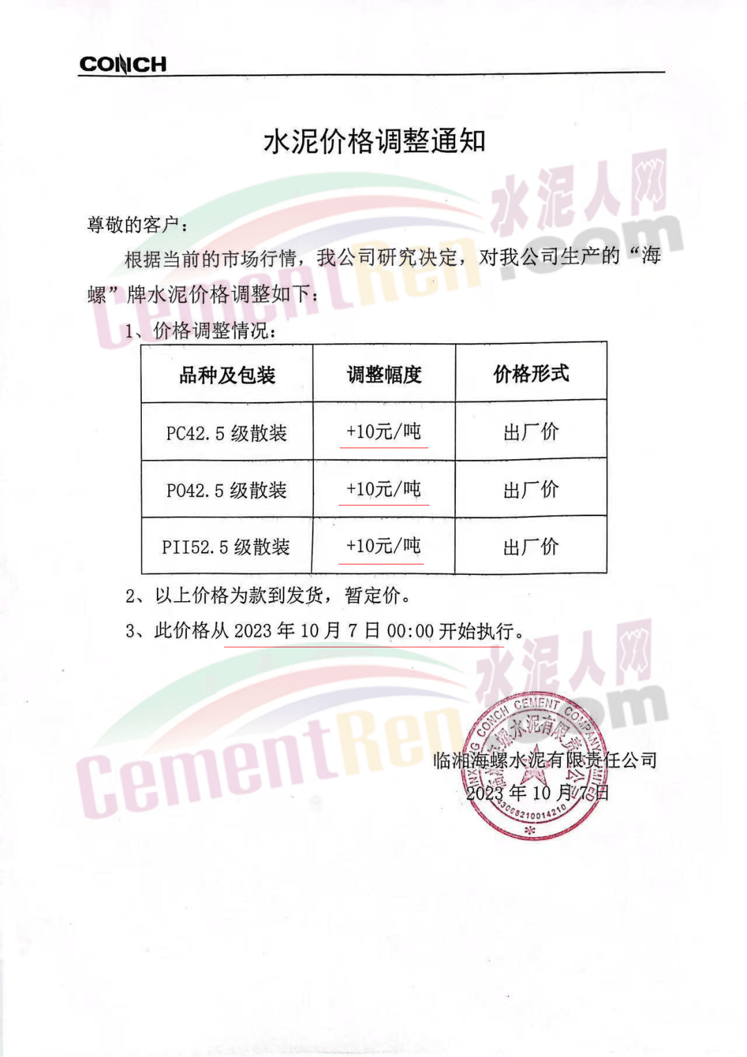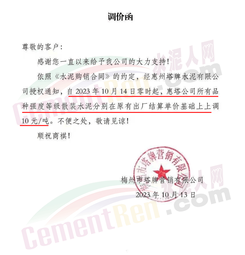 梅州市塔牌營(yíng)銷有限公司通知,經(jīng)惠州塔牌水泥有限公司授權(quán)通知,自2023年10月14日零時(shí)起,惠塔公司所有品種強(qiáng)度等級(jí)散裝水泥分別在原有出廠結(jié)算單價(jià)基礎(chǔ)上上調(diào)10元/噸。