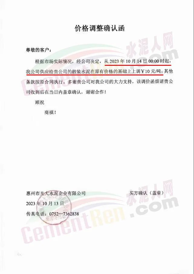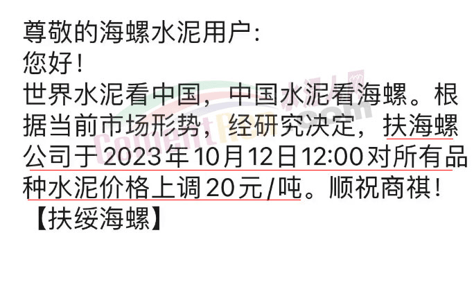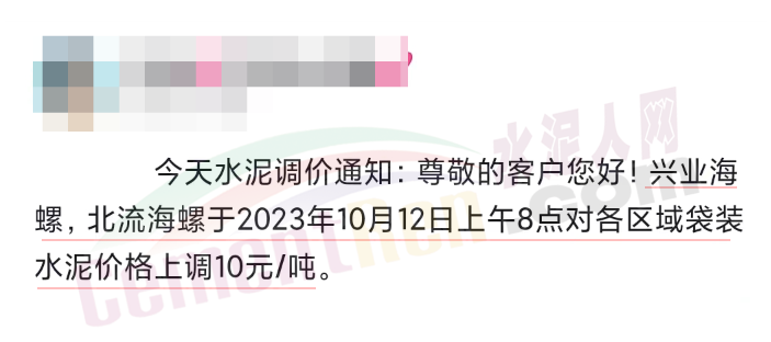 10月13日,廣東多區(qū)域經(jīng)銷商收到通知,水泥價(jià)格將于14日起上調(diào)10元/噸。華潤(rùn)水泥投資有限公司通知,自10月14日0時(shí)起,公司珠三角(含惠州)及粵西各區(qū)域全品種散裝水泥價(jià)格上調(diào)10元/噸。