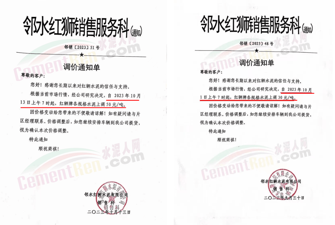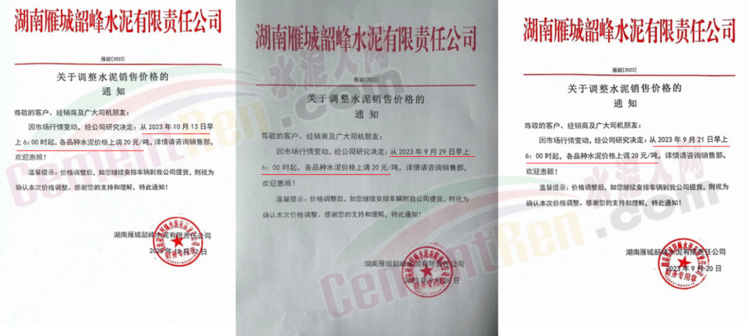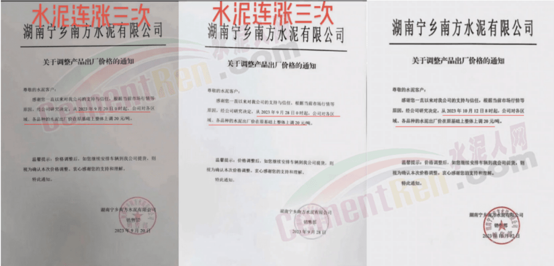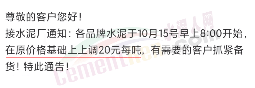湖南寧鄉(xiāng)南方水泥有限公司分別于9月20日,9月28日,10月12日三次通知上調(diào)水泥報(bào)價(jià)各20元/噸,累計(jì)上調(diào)60元/噸。