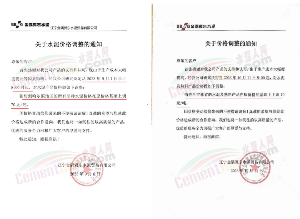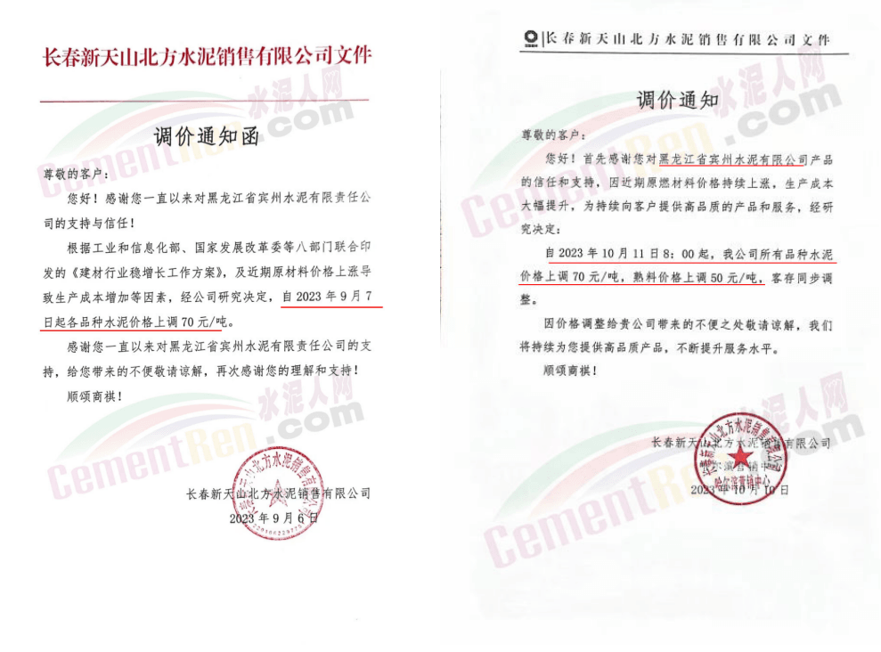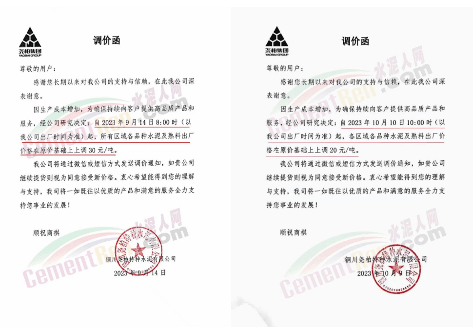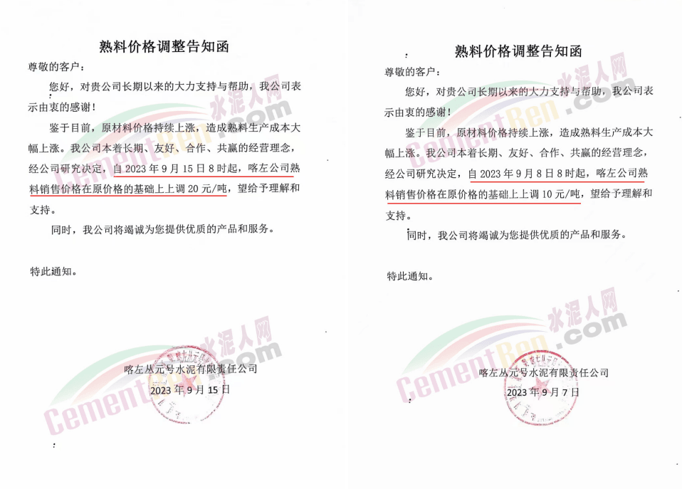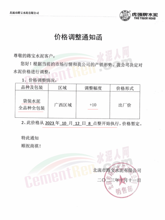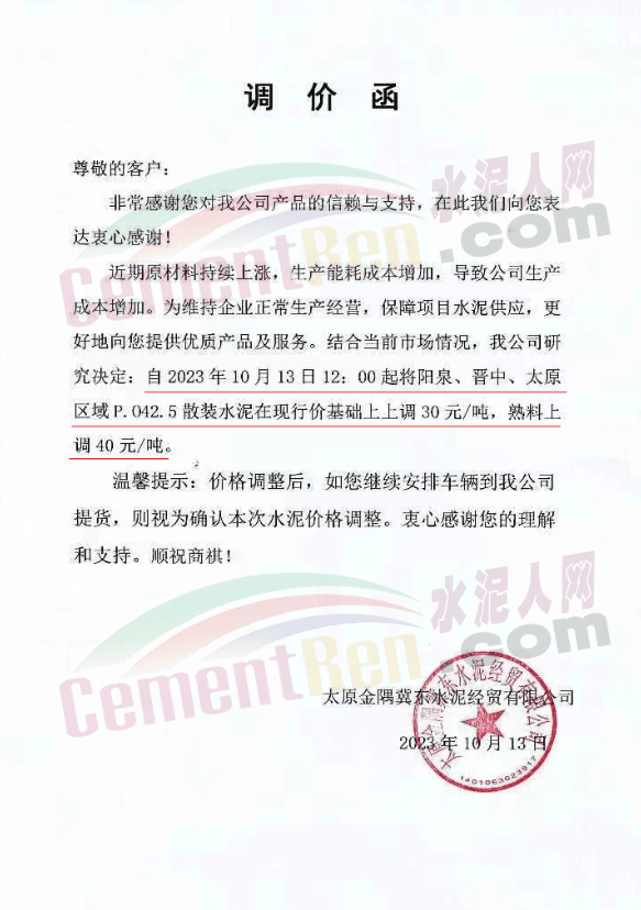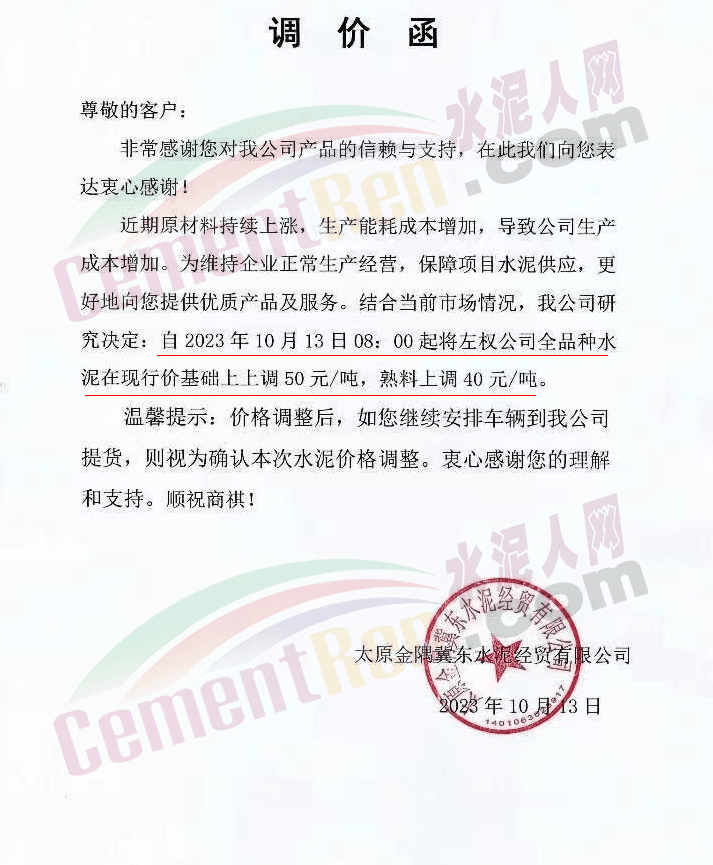 日前,山西太原金隅冀東水泥經(jīng)貿(mào)有限公司通知稱,近期原材料持續(xù)上漲,生產(chǎn)能耗成本增加,導(dǎo)致公司生產(chǎn)成本增加。為維持企業(yè)正常生產(chǎn)經(jīng)營(yíng),結(jié)合當(dāng)前市場(chǎng)情況,公司研究決定,自2023年10月13日08:00起將左權(quán)公司全品種水泥在現(xiàn)行價(jià)基礎(chǔ)上上調(diào)50元/噸,熟料上調(diào)40元/噸。自12時(shí)起將陽(yáng)泉、晉中太原區(qū)域PO425散裝水泥在現(xiàn)行價(jià)基礎(chǔ)上上調(diào)30元/噸,熟料上調(diào)40元/噸。