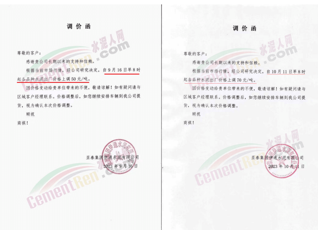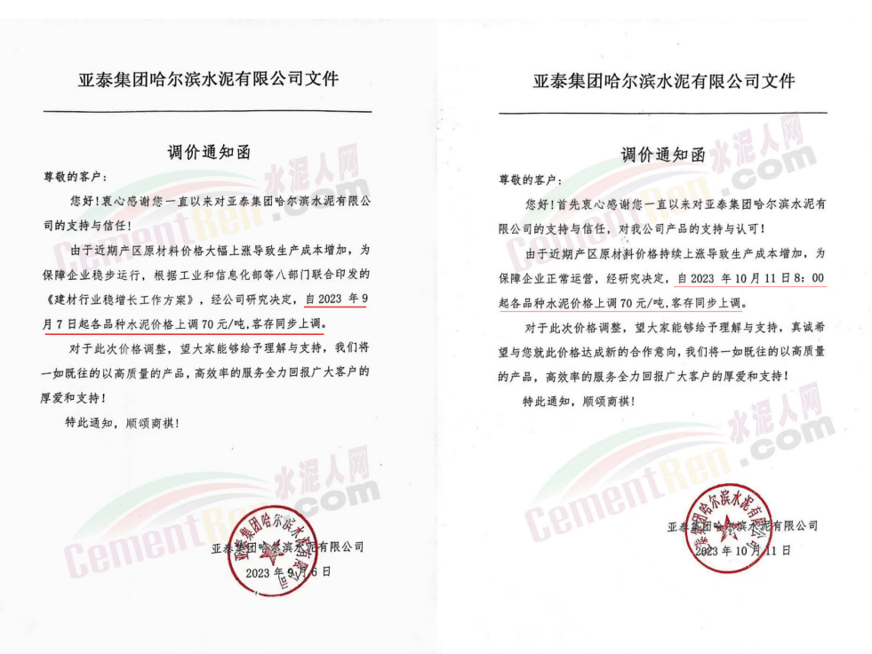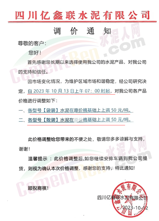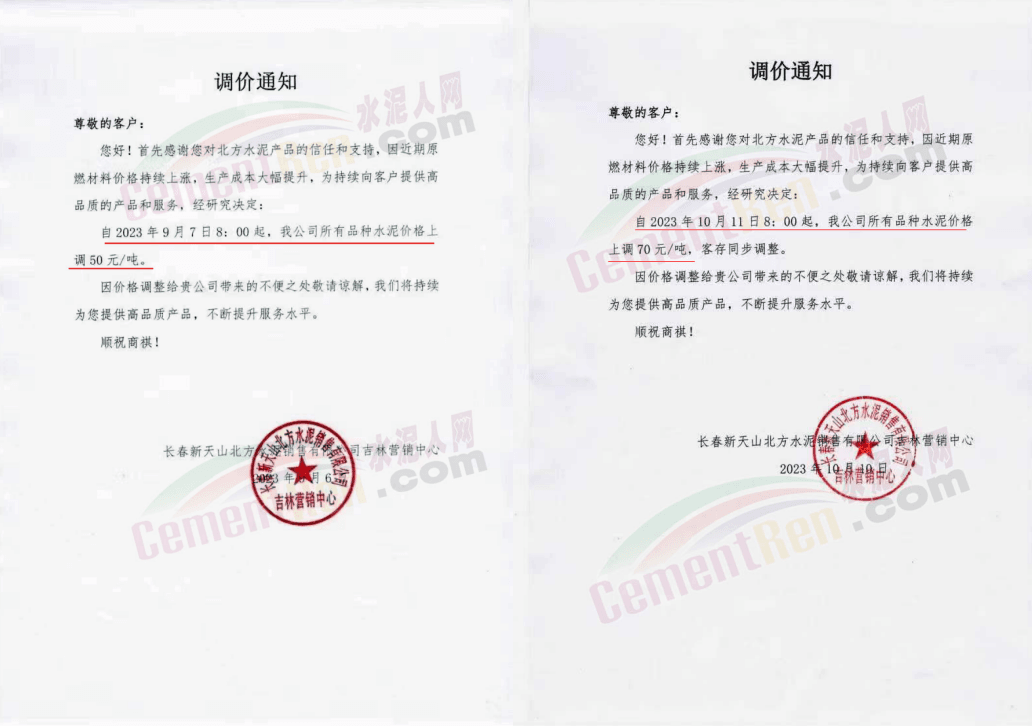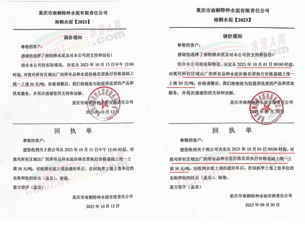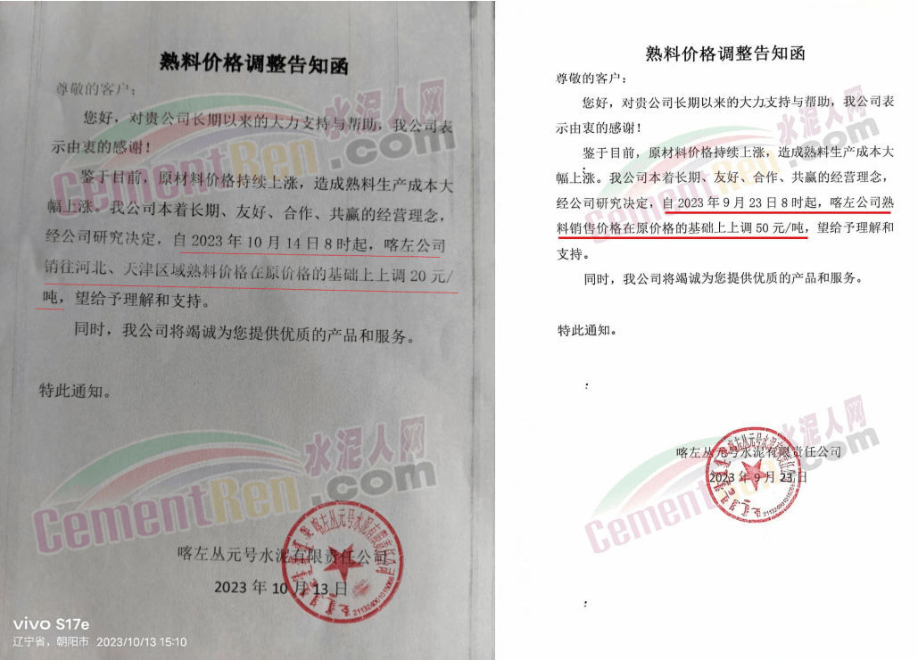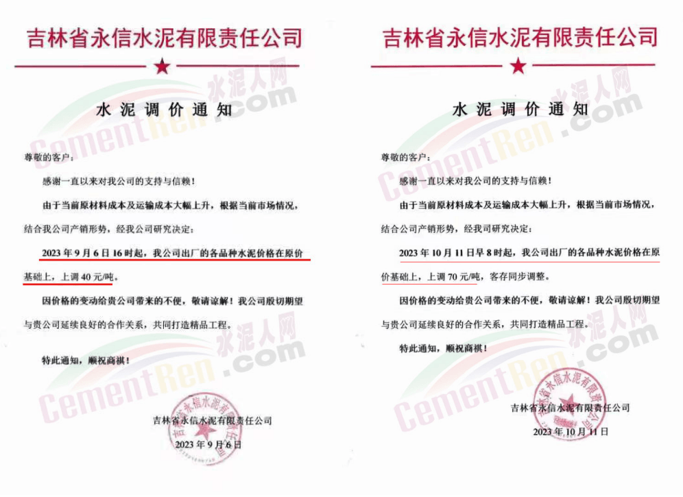 日前,山西太原金隅冀東水泥經(jīng)貿(mào)有限公司通知稱,近期原材料持續(xù)上漲,生產(chǎn)能耗成本增加,導(dǎo)致公司生產(chǎn)成本增加。為維持企業(yè)正常生產(chǎn)經(jīng)營(yíng),結(jié)合當(dāng)前市場(chǎng)情況,公司研究決定,自2023年10月13日08:00起將左權(quán)公司全品種水泥在現(xiàn)行價(jià)基礎(chǔ)上上調(diào)50元/噸,熟料上調(diào)40元/噸。自12時(shí)起將陽(yáng)泉、晉中太原區(qū)域PO425散裝水泥在現(xiàn)行價(jià)基礎(chǔ)上上調(diào)30元/噸,熟料上調(diào)40元/噸。
