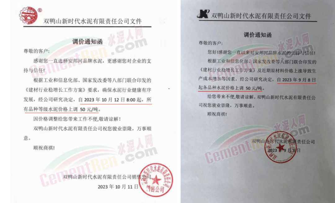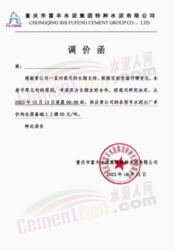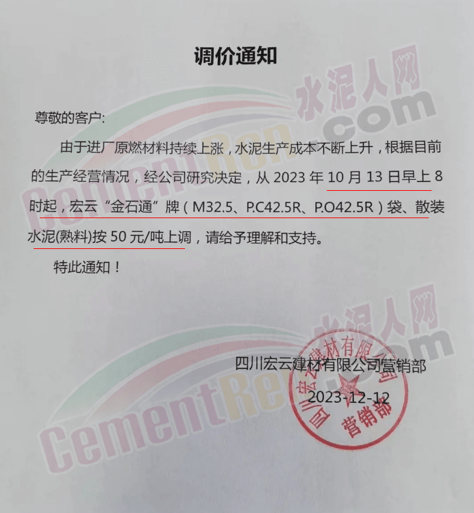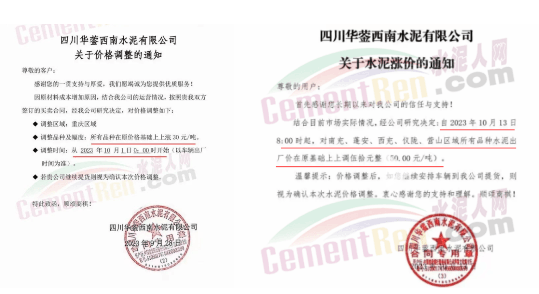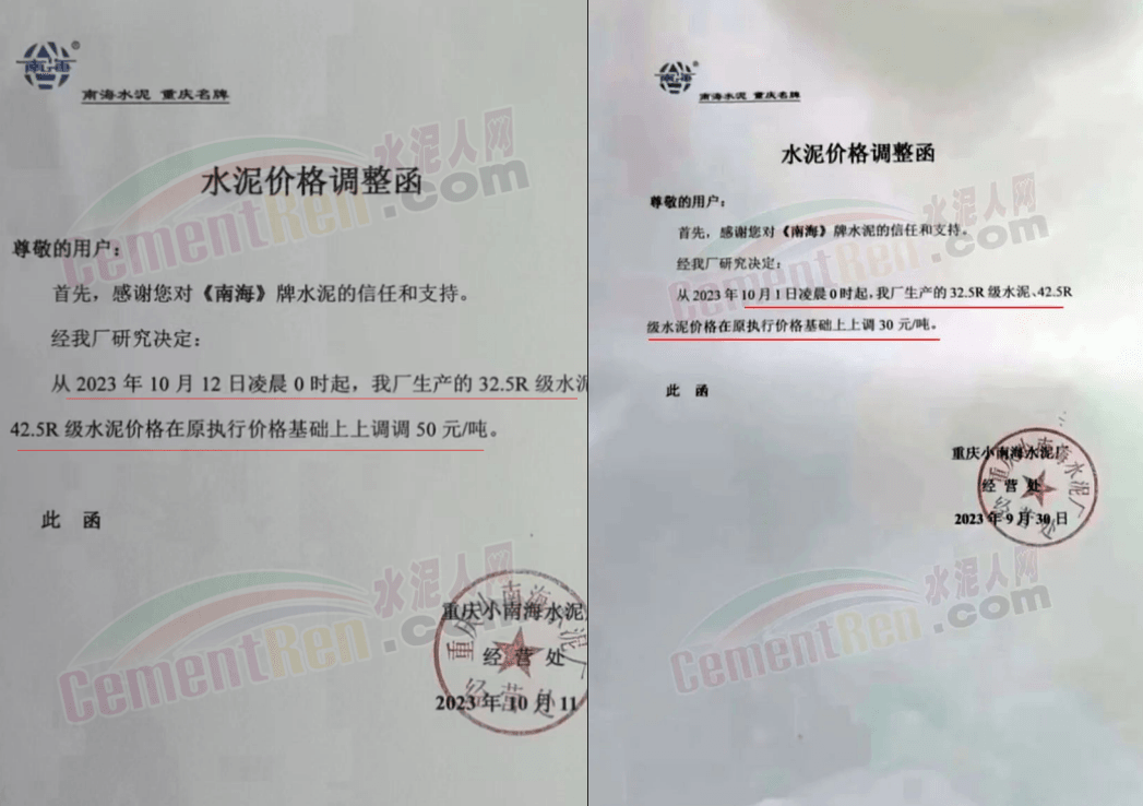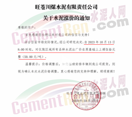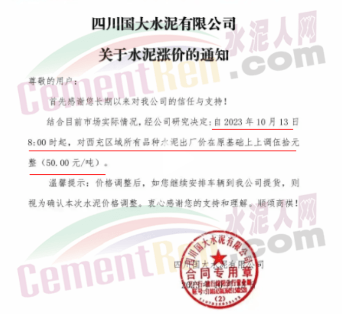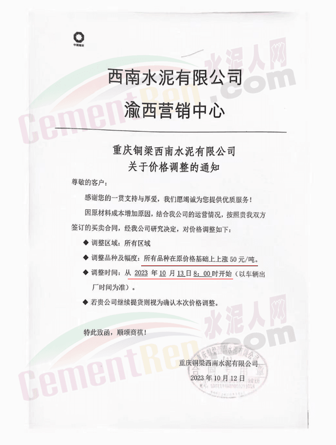 同日,川渝區(qū)域華新、西南、富豐、小南海等多家品牌水泥通知上調(diào)水泥報(bào)價(jià)50元/噸。