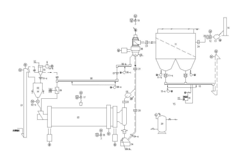 來(lái)自調(diào)配站的原料鋼渣份、礦渣粉、粉煤灰混合料經(jīng)提升機(jī)〔01〕、稱重穩(wěn)流倉(cāng)〔02〕至球磨機(jī)〔03〕進(jìn)行粉磨,粉磨后的粉料由料氣混合裝置〔04〕混合,料隨氣入選粉機(jī)分選。分選后粗粉經(jīng)空氣斜槽〔08〕輸送至沖板流量計(jì)〔09〕計(jì)量后入球磨機(jī)循環(huán)粉磨,細(xì)粉由除塵器〔11〕收集經(jīng)空氣斜槽〔15〕輸送至入庫(kù)提升機(jī)提升入庫(kù)。選粉機(jī)設(shè)有一次風(fēng)口、二次風(fēng)口、三次風(fēng)口。