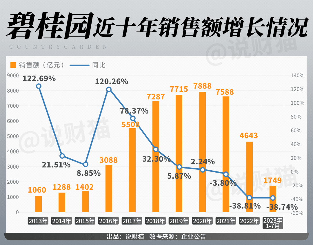 碧桂園近幾年房產(chǎn)售價(jià)持續(xù)下滑,僅2020到2022年,碧桂園全國折合均價(jià)持續(xù)下降,分別為8402元/平方米、8033元/平方米、7886元/平方米,但2022年,碧桂園銷售額仍然大跌38.81%,減少了近3000億,交出了并不完美的答卷。2023年上半年更是巨虧514.61億,可謂是生存艱難。