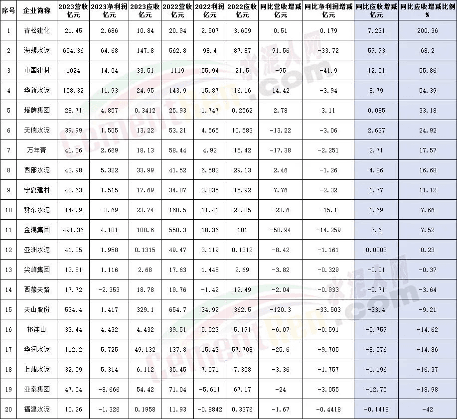 今年上半年各企業(yè)公布的半年報(bào)可見,20家上市企業(yè)中12家應(yīng)收賬款增加,占比達(dá)60%。其中海螺水泥2023年上半年同比2022年同期應(yīng)收賬款及票據(jù)增加59.93億元,增幅達(dá)68.2%。同期營業(yè)收入增加91.56億元,凈利潤減少33.72億元,增收不增利的情況明顯。