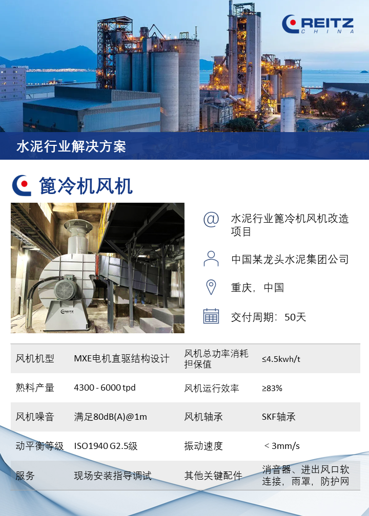 銳志風(fēng)機(jī)憑借優(yōu)秀的技術(shù)設(shè)計(jì)和精湛的制造工藝,幫助該客戶(中國北方最大的水泥生產(chǎn)商和供應(yīng)商)在篦冷機(jī)風(fēng)機(jī)改造項(xiàng)目中,順利實(shí)現(xiàn):