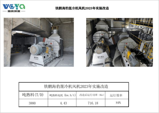 3.運行效率提高:改造后,篦冷機風機的運行效率達到了84%。這表明設(shè)備的性能得到了顯著提升,生產(chǎn)過程更為高效,減少了資源的浪費。
