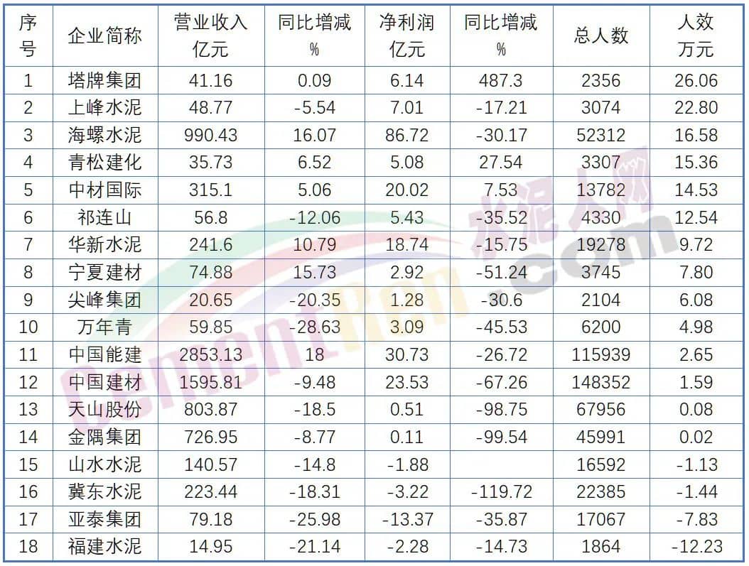 上市公司“人效”大排名,塔牌水泥人均26.06萬(wàn)元,拔得頭籌