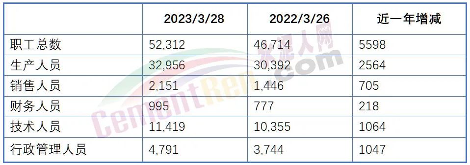 從海螺上市公司數(shù)據(jù)可見,海螺水泥員工人數(shù)已達(dá)52312人,較2022年新增5598人,前三季度人均創(chuàng)利16.58萬(wàn)元。近一年來(lái),海螺水泥生產(chǎn)人員增加達(dá)2564人,技術(shù)及行政管理人員增加超千人。
