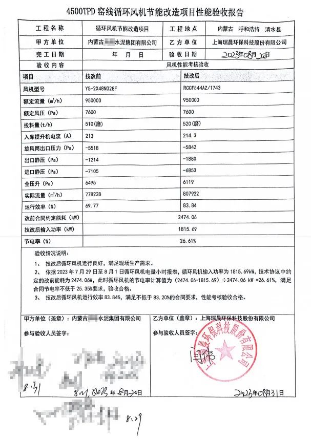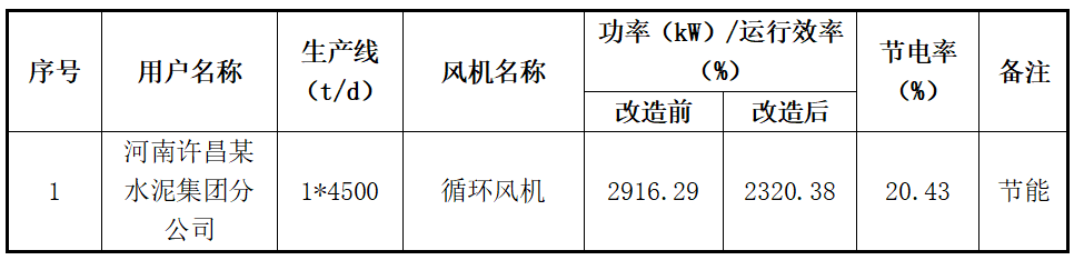 同期瑞晨環(huán)保還參與了河南許昌一家水泥公司循環(huán)風機技術改造項目的標定、設計和實施。新風機于2023年3月份安裝完成,改造后循環(huán)風機運行效果較好,小時節(jié)電量達到了595.91kWh,節(jié)電率達到了20.43%,節(jié)電效果顯著,項目于2023年4月完成測試、驗收。