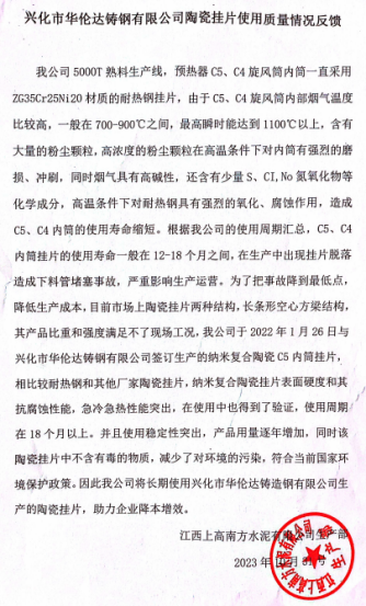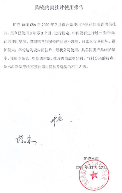 礦峰水泥1#線C5A自2020年7月份開始使用江蘇凱達(dá)的納米復(fù)合高強(qiáng)度陶瓷內(nèi)筒掛片,至今已使用3年零3個(gè)月,運(yùn)行穩(wěn)定,中間沒有進(jìn)行過一次維修。此前使用市場上長條形陶瓷產(chǎn)品很不理想,使用效果不好,日常運(yùn)行易損壞、維護(hù)量大。
